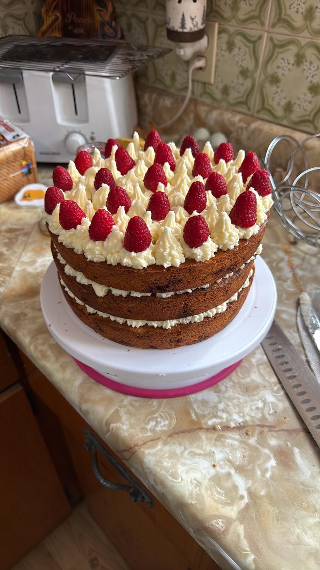 My very first cake for my wife’s birthday! Easier than I thought, except for the piping
