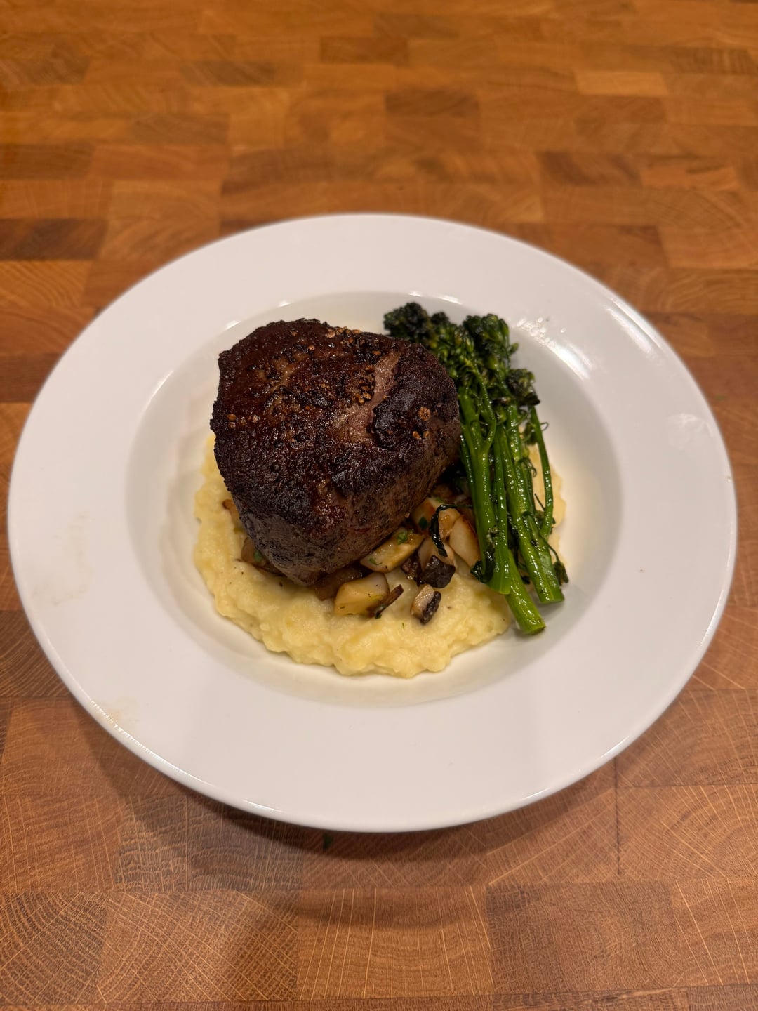 [Homemade] Filet on sautéed porcini and shallots, potato and parsnip purée and broccolini.