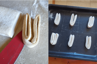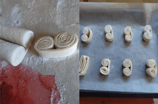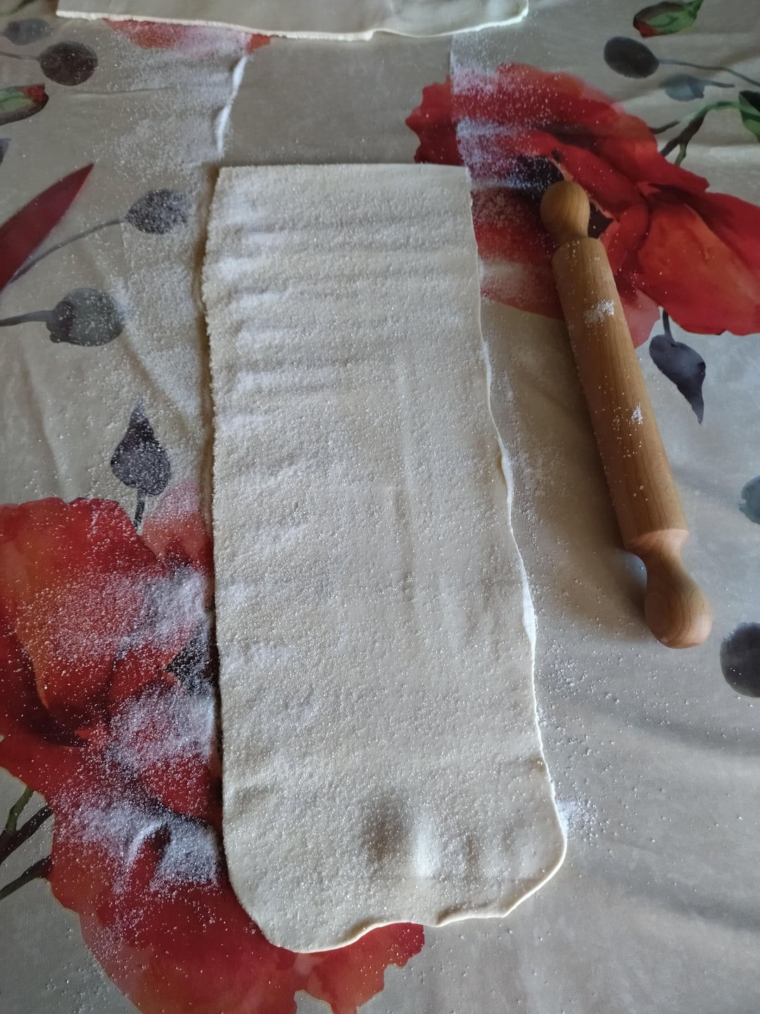 Preparing the palmiers -> Take the puff pastry and use a rolling pin to roll it out into a rectangle about 4-5 millimeters thick. Sprinkle the surface generously with sugar and gently press it down with the rolling pin. Roll or fold the two ends to the center and cut the “roll” into slices about 2-3 centimeters thick. Arrange the palmiers on a baking sheet lined with parchment paper, spacing them apart, sprinkle with more sugar, and bake in a preheated oven at 190°C (375°F) for about 20 minutes, until golden brown.
