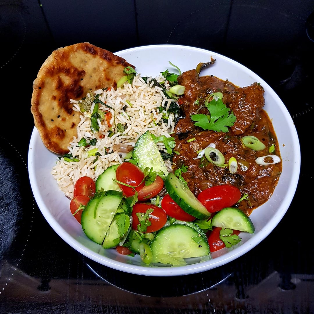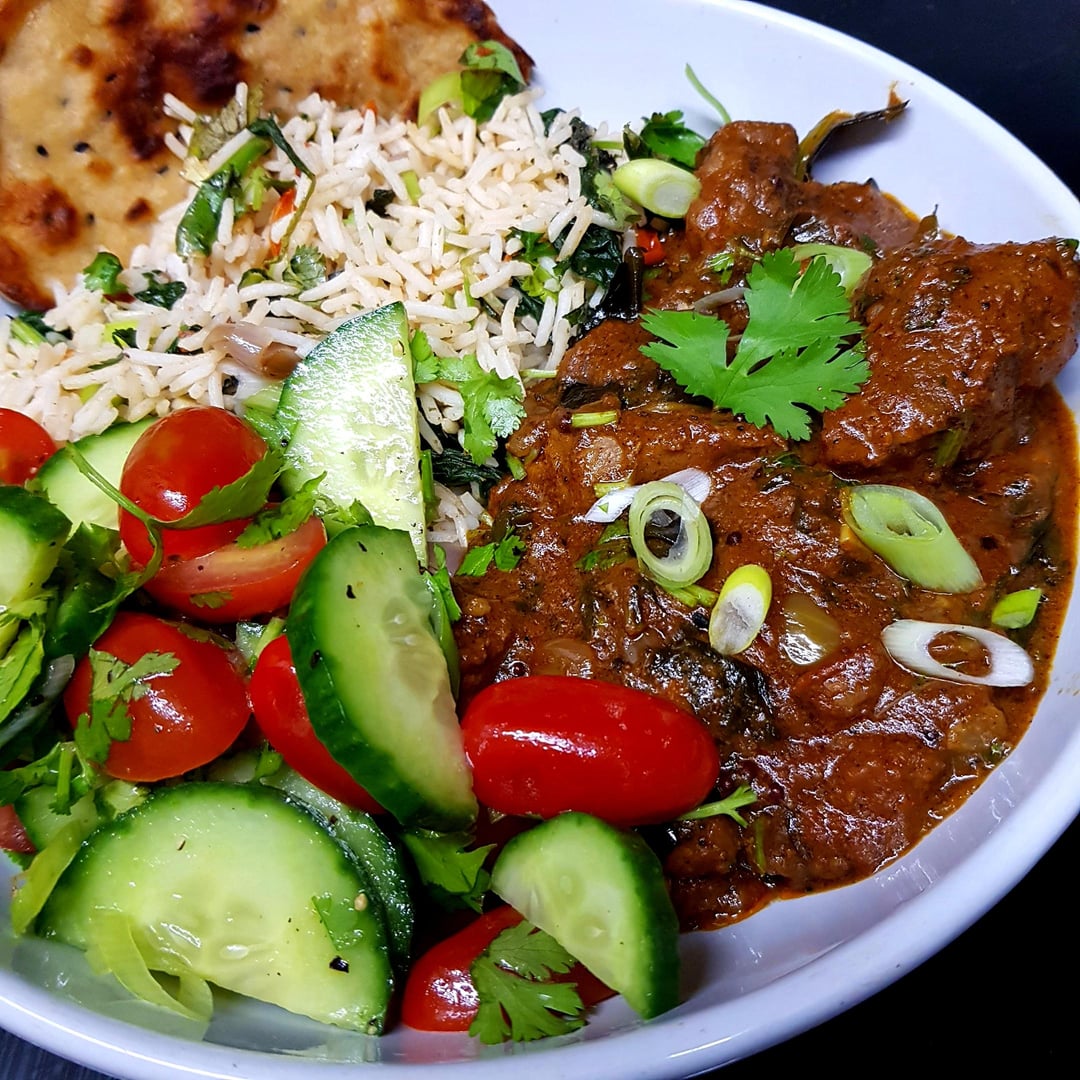 South Indian Lamb Curry, Lime Rice, Cucumber and Tomato Salad and Fresh Roti. Finished with Mint and Coriander.