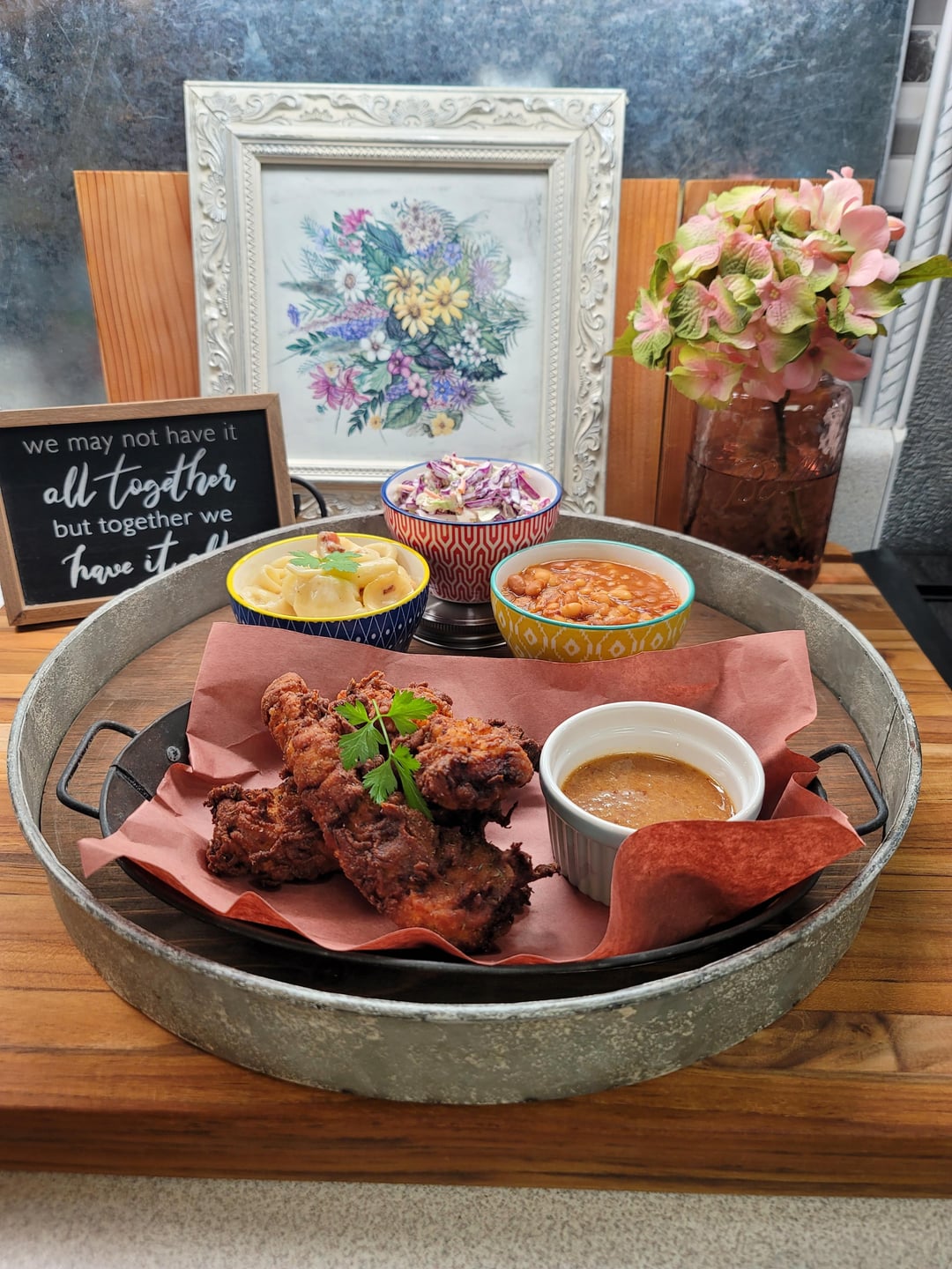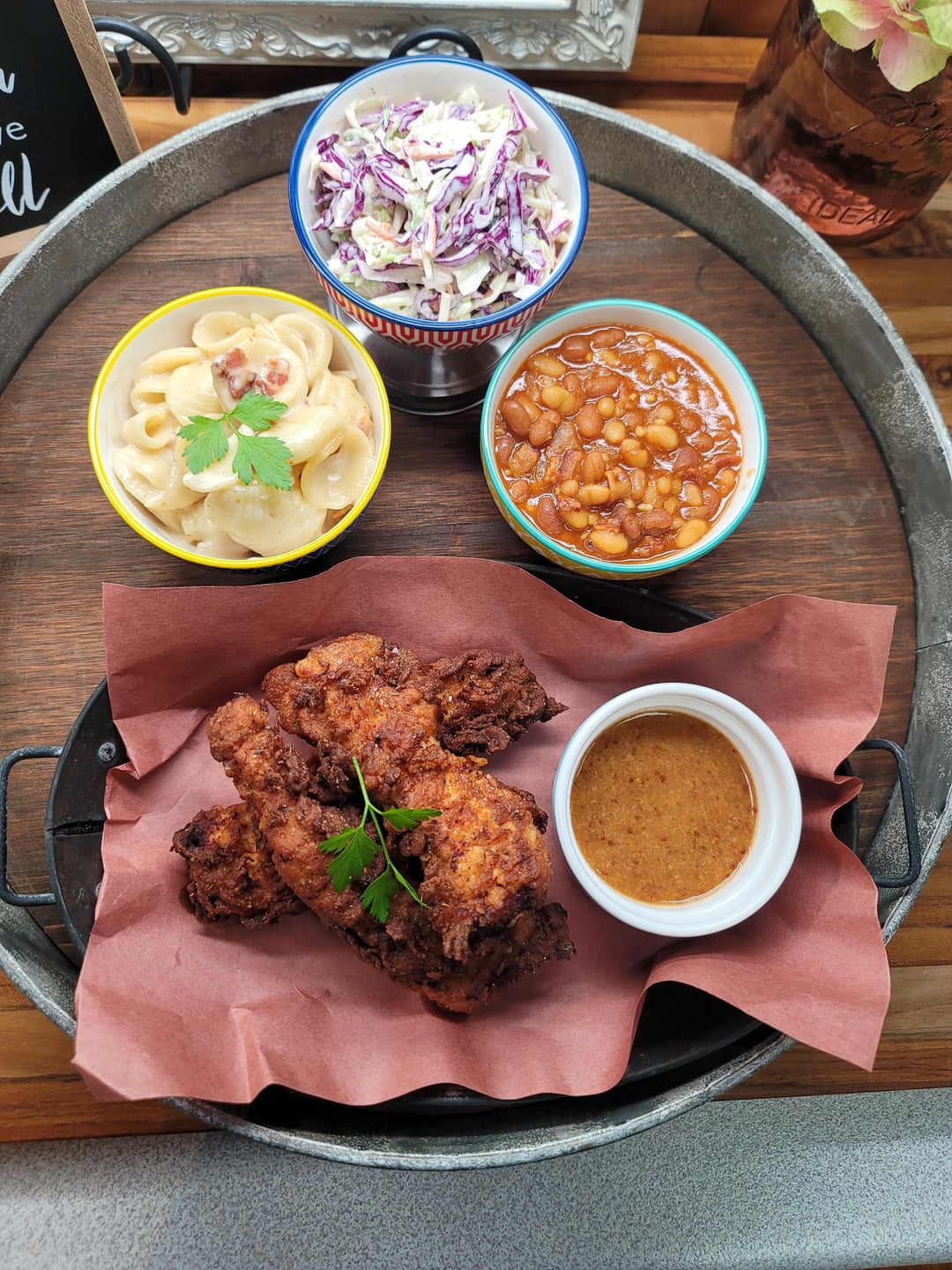 [Homemade]Fried Chicken Strips w/ Bacon Mac-n-Cheese, Baked Beans, Cole Slaw, & Honey Mustard Dipping Sauce!!!