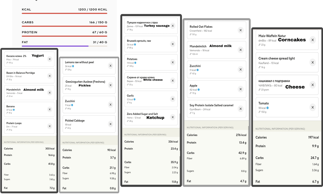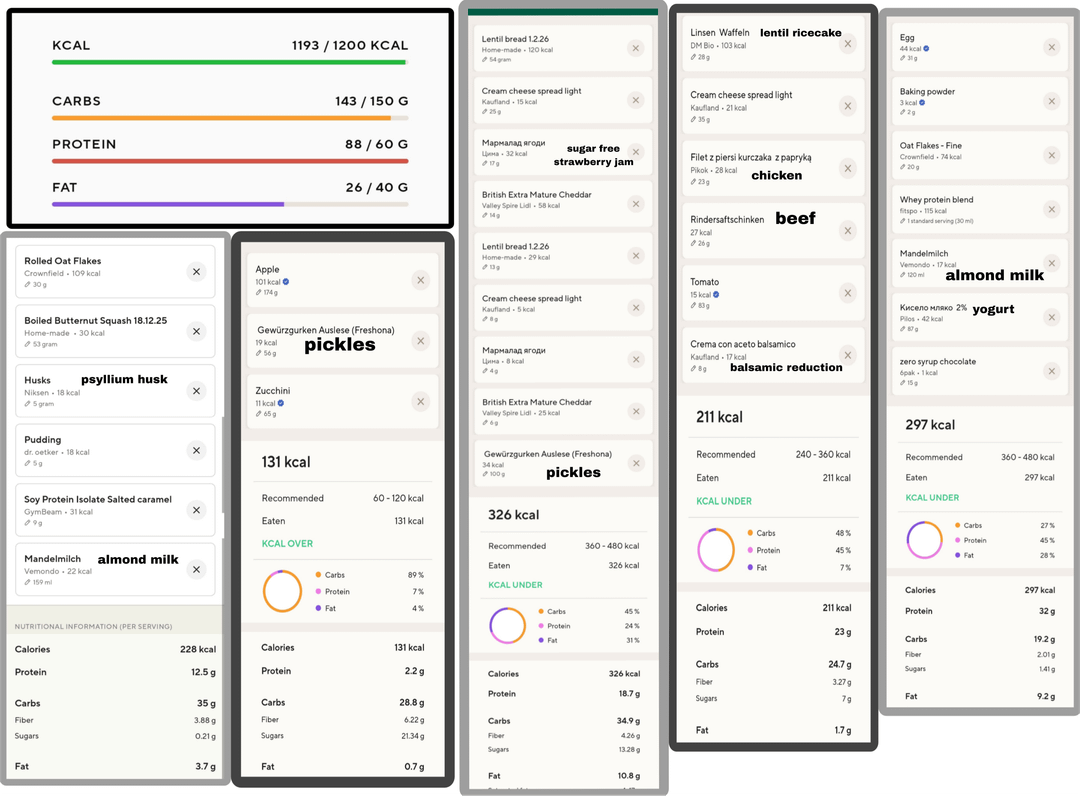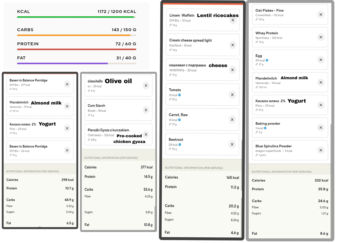 Pictures of everything I ate in a day, followed by a breakdown of the macronutrients and ingredients. Descriptions of the food itself below: