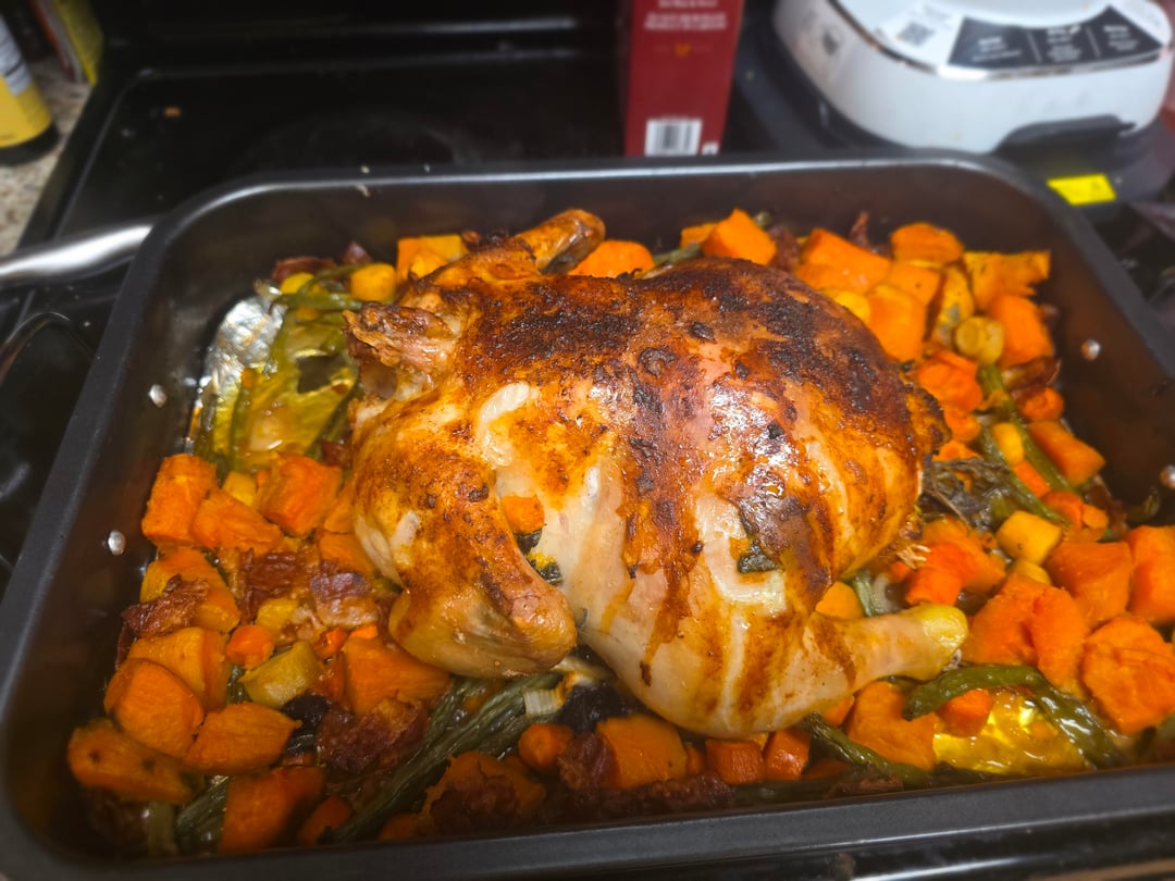 5.6 lbs whole chicken, tossed in johhnys seasoning, stuffed with celery and sage, then coated in butter. The chicken is sitting on a bed of garlic butter brown sugar glazed sweet potatoes, multicolor carrots, onions, green beans, chopped maple bacon, and a little bit of chicken broth for moisture. Baked for roughly 1hr 45 at 400⁰, rotated twice (once at 60 min again at 1hr 30 min) to get an even crisp skin.