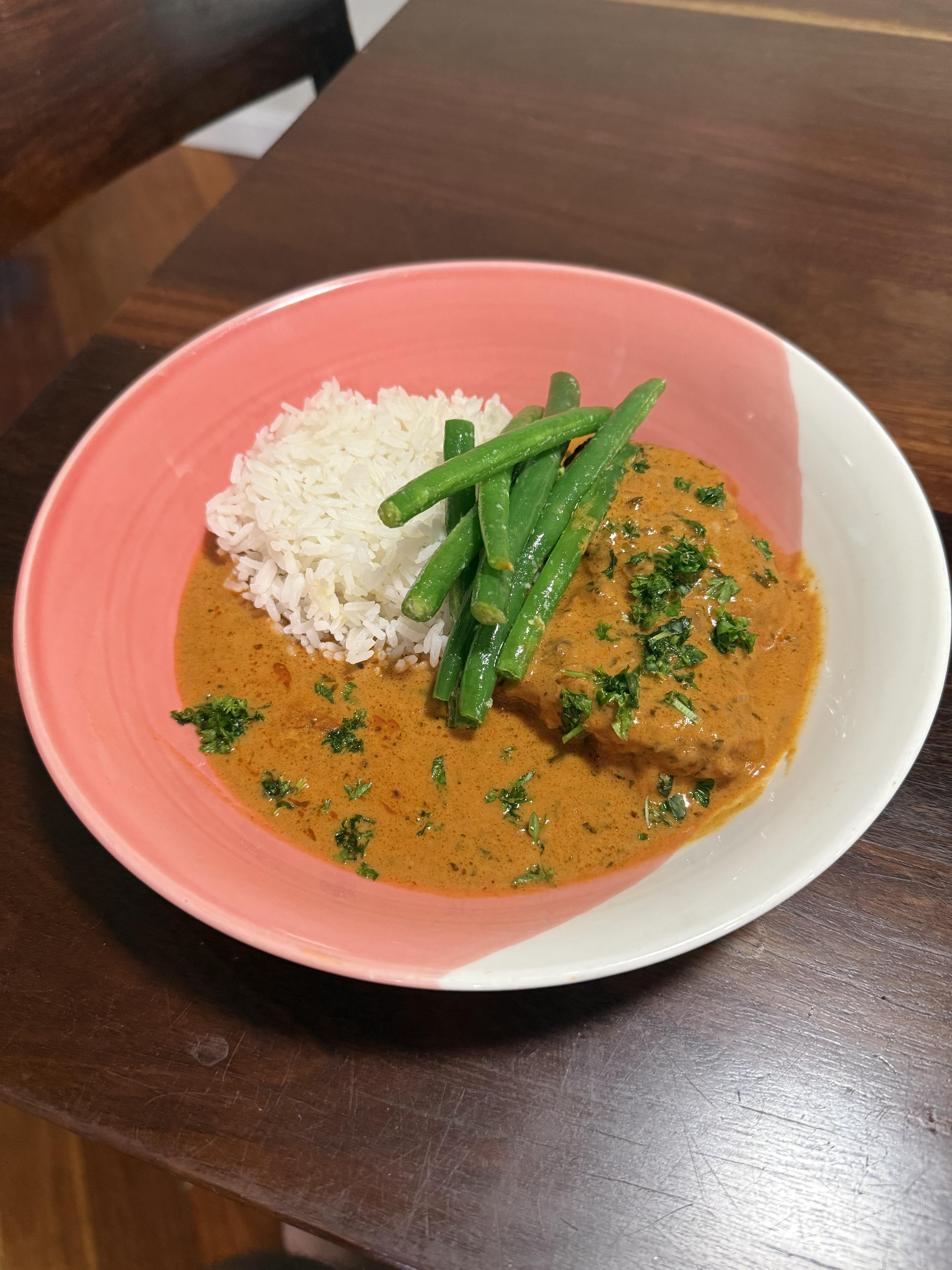 Tuscan chicken, side of sautéed beans and steamed rice.