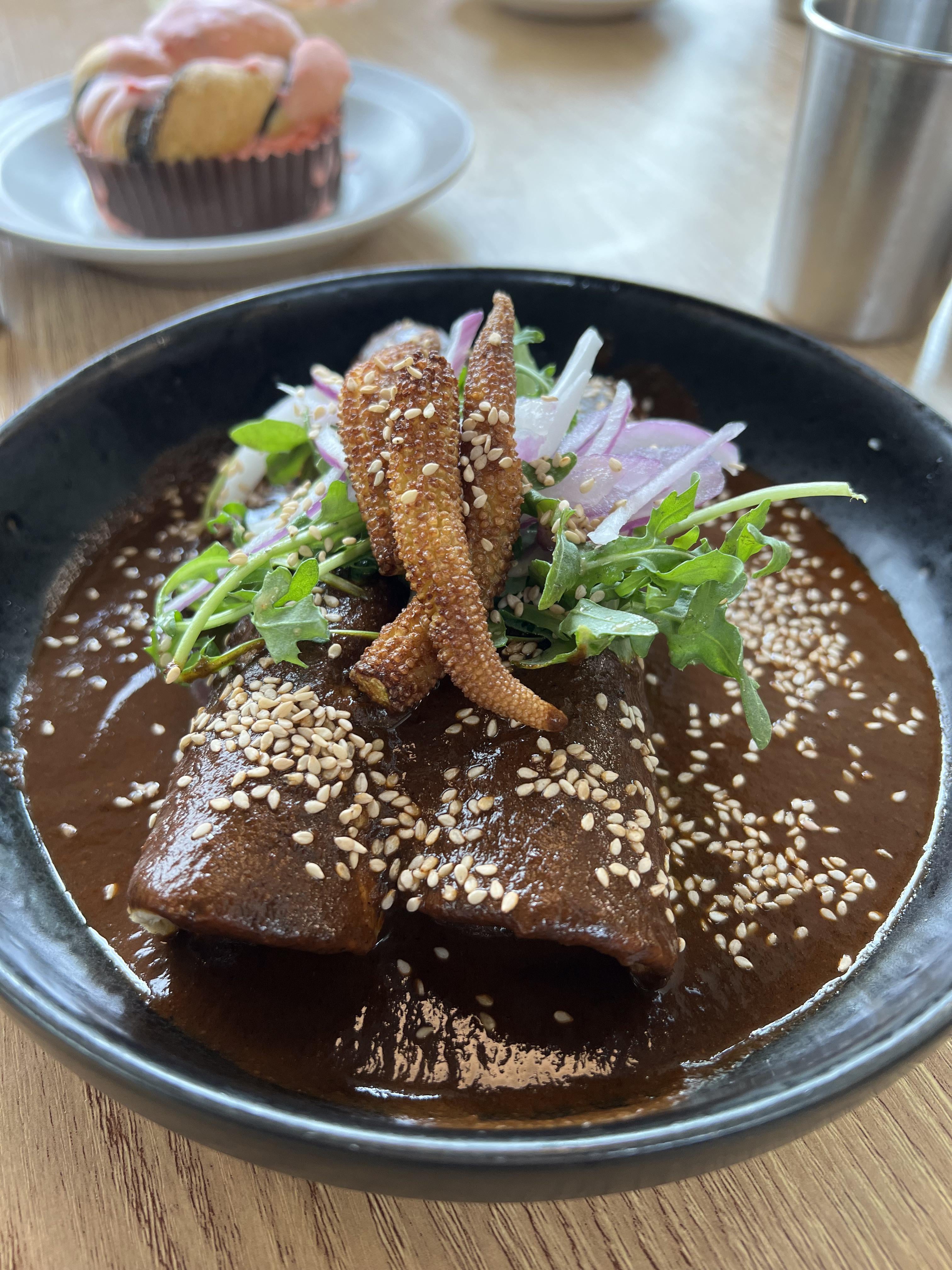 Olotillo Blanco Tortillas, roasted Pork, Mole Negro, Sesame seeds, arugula salad, red onion from CasaEma by yourhomeguide Food Porn