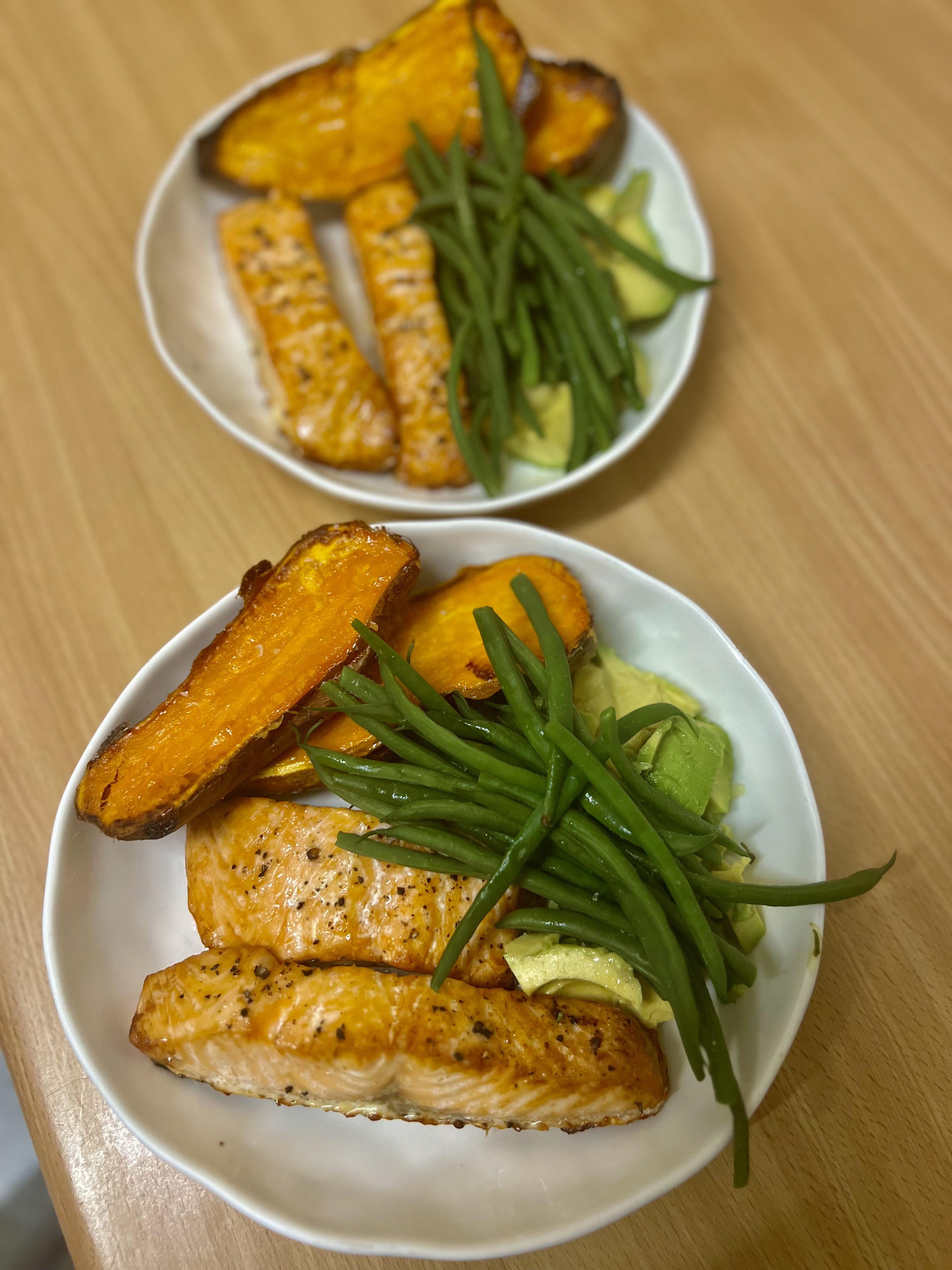 Dinner tonight: salmon, avocado, green beans & roasted sweet potato by OmuldinSubteran Dinner Tonight Tonight's Dinner