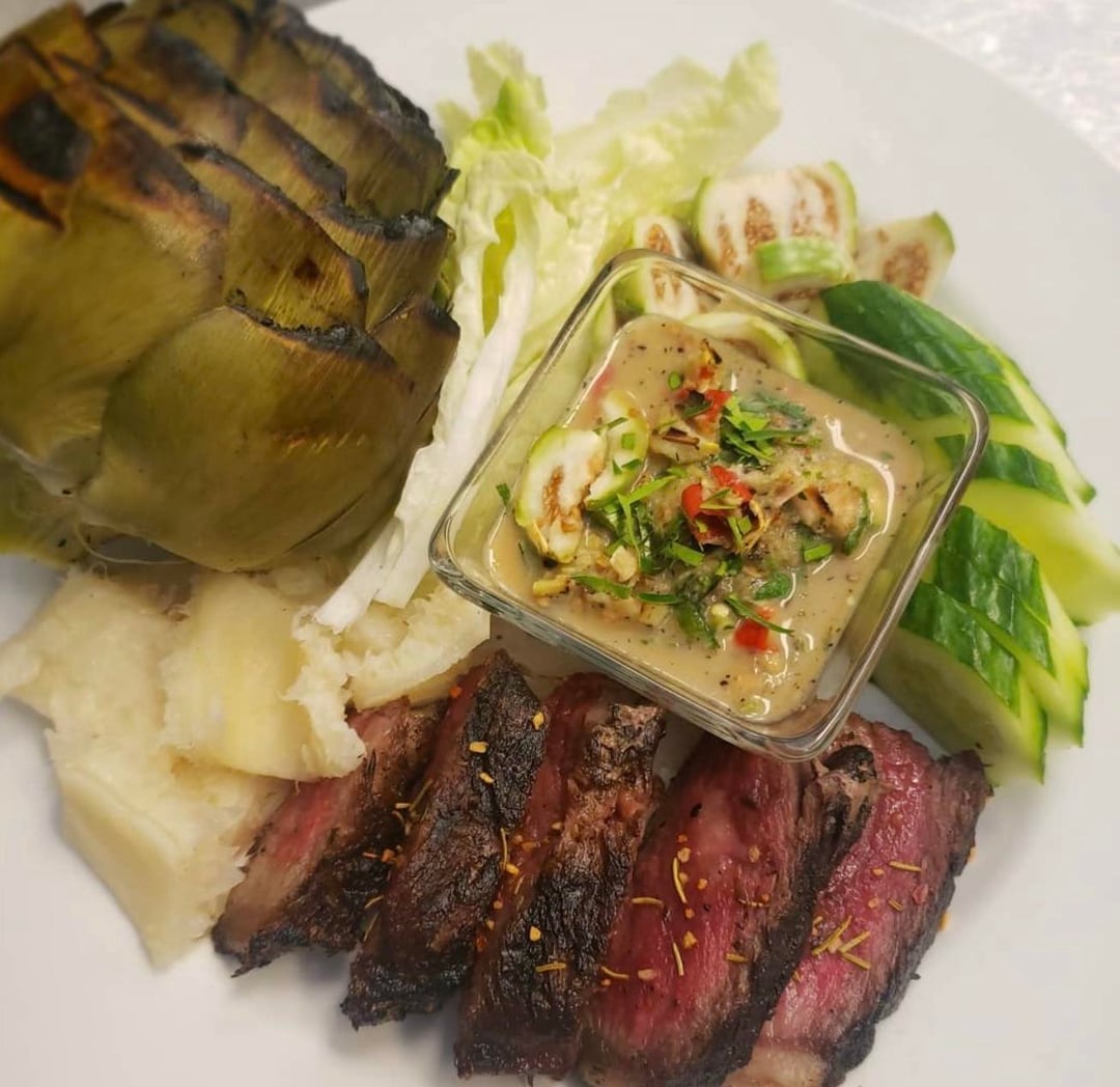 I paired it with grilled ribeye, beef tripe, cucumber, Thai eggplant, Napa cabbage, and grilled artichoke. The artichoke was incredible with this sauce, a perfect combination!