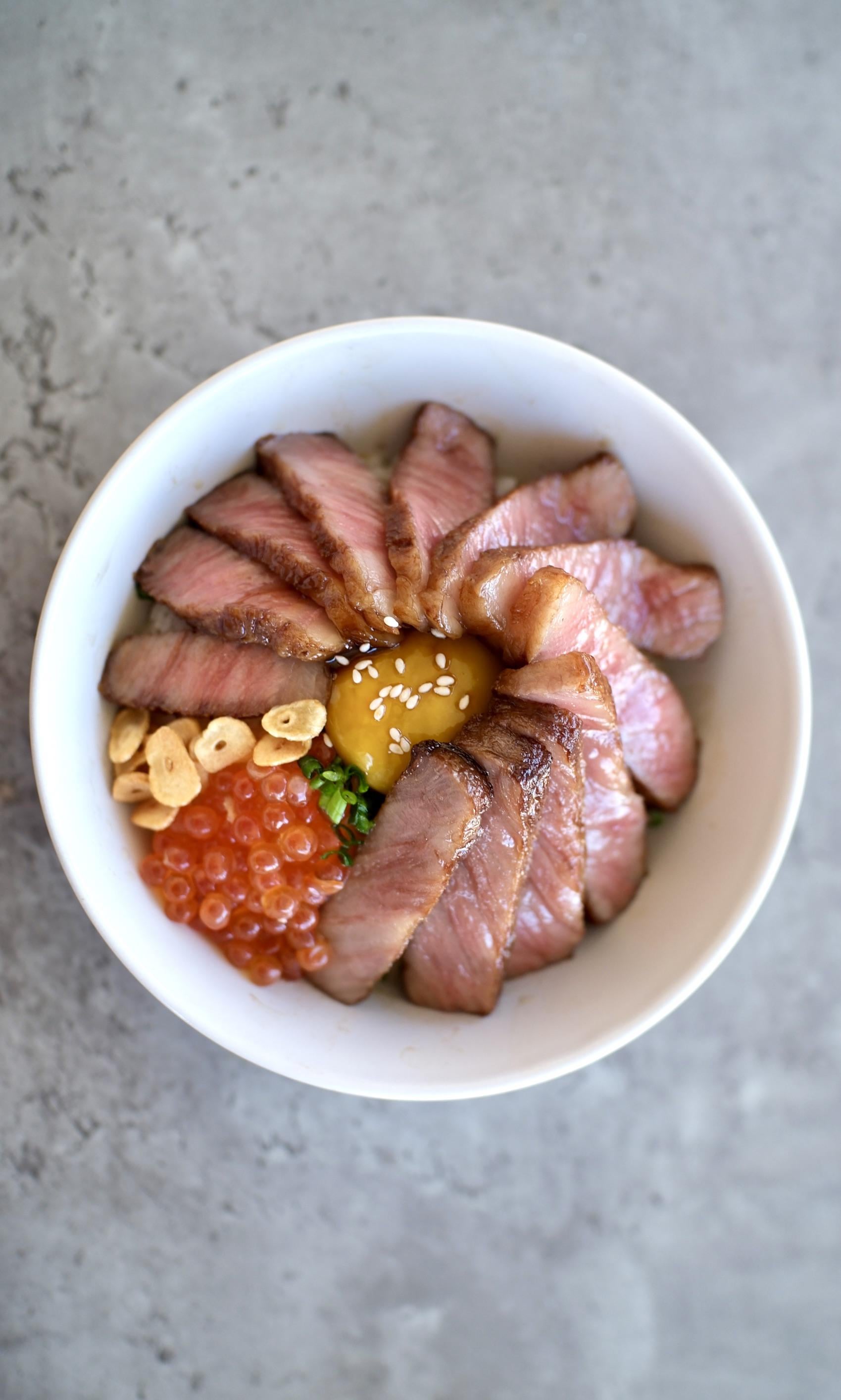 Used a small A5 NY strip and seared on cast iron. Marinated salmon roe for the ikura, fried some garlic, and cured the egg yolk. It was kind of a pain to plate because my bowl was a tad too small but it was a nice treat 🙂 by Austincraft101 Food