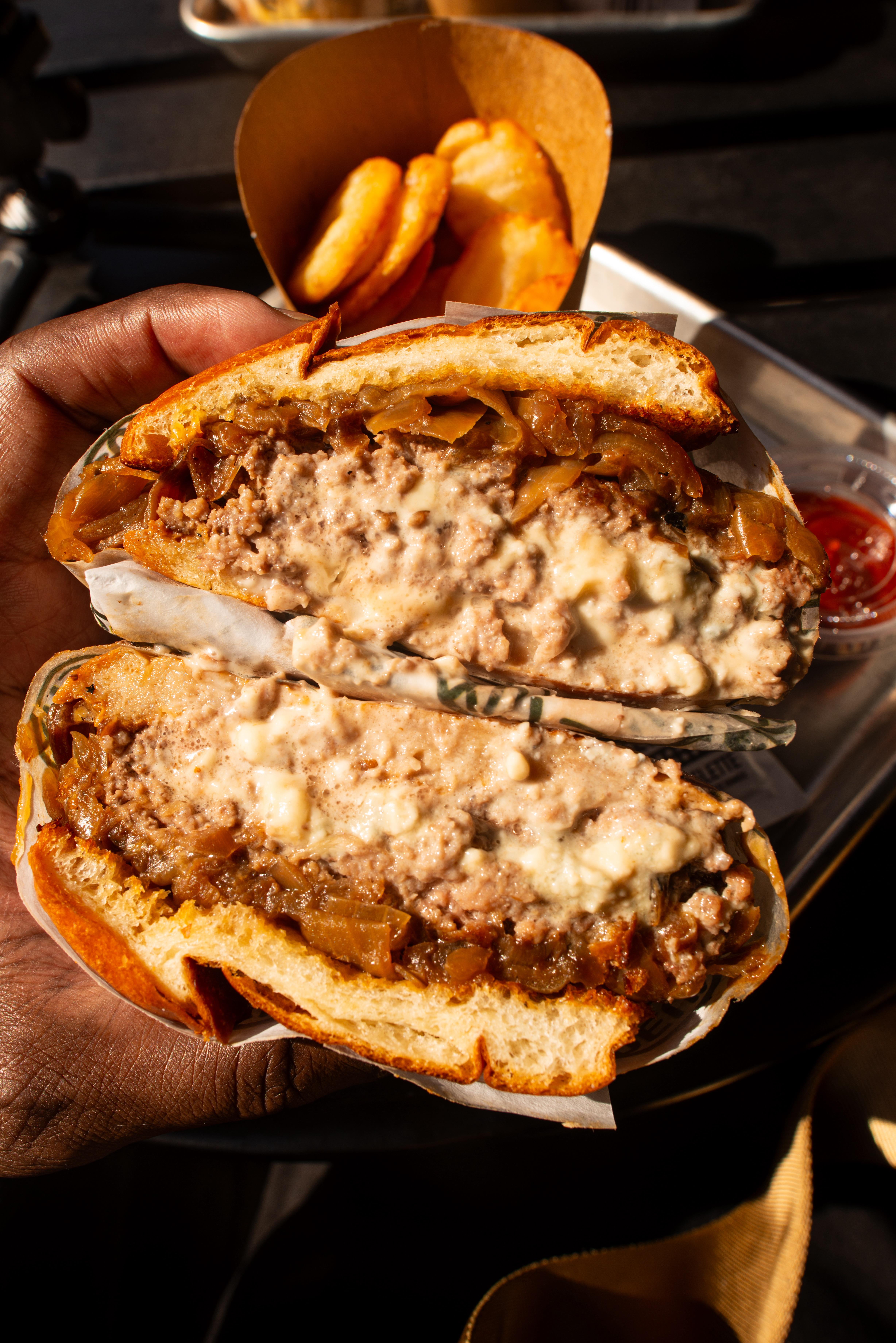 two waygu beef patties, brioche bun, blue cheese, caramelized onions, and a peppercorn dipping sauce by RumPunchKid Food