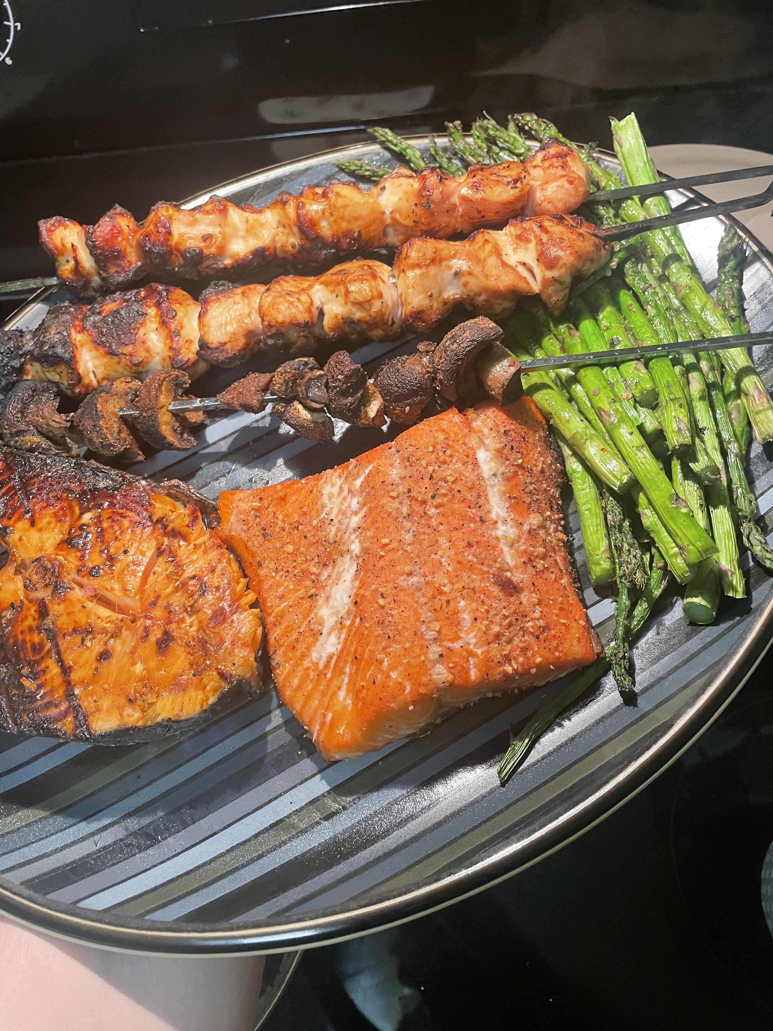 Going counter clockwise the spread consists of: garlic Parmesan marinated chicken skewers from the local meat market, asparagus from the… grocery store lol, sockeye salmon and king salmon from my Sitka seafood market box, and some mushrooms (for my mom, not me hahah). Only thing not pictured is some steamed broccoli!