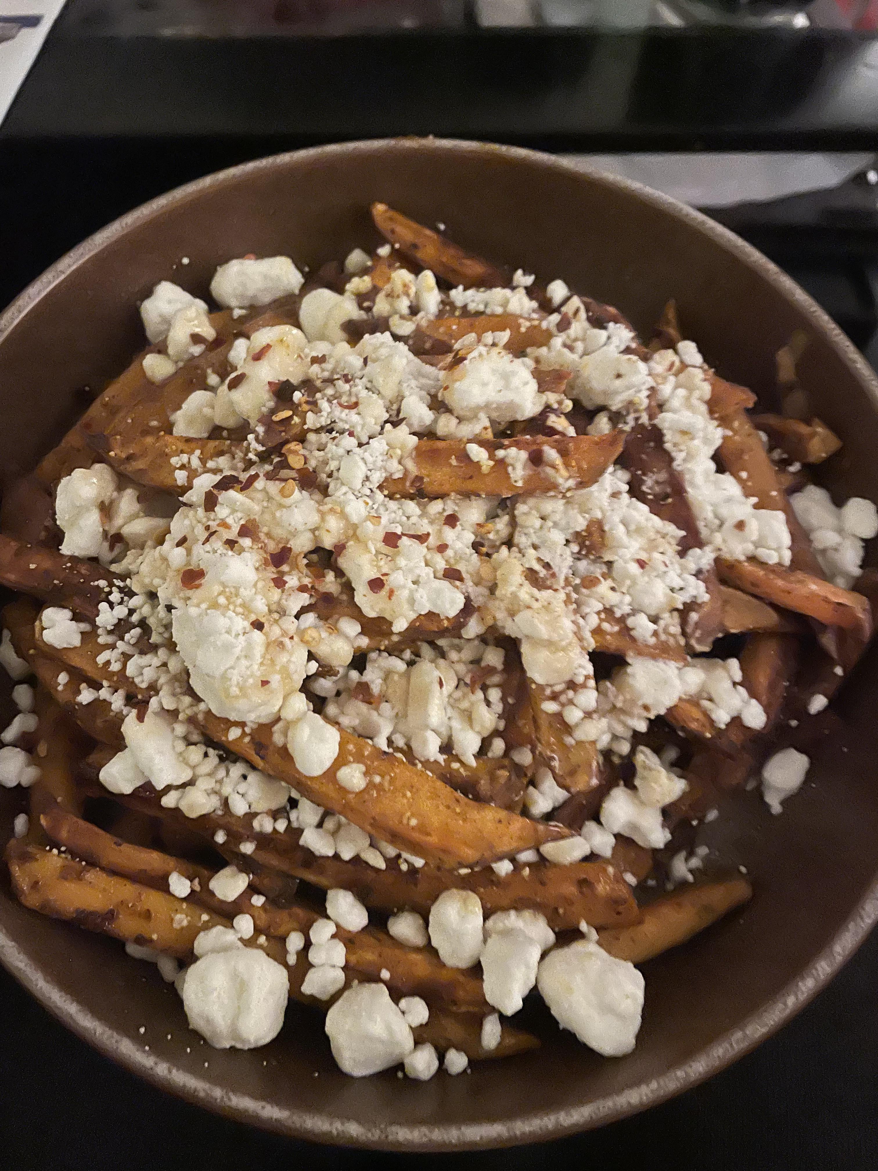 Before I get attacked, the plate is small! And the goat cheese crumbles measured to 2.5oz (honestly could’ve gone with less.) 164 cal sweet potato + 120 cal tbsp olive oil + 2.5 oz goat cheese (175 cal) = 459 calorie dinner. I season the sweet potato fries with salt, pepper, onion powder, garlic powder, garlic salt, paprika, cumin, chili powder, berber spice, cayenne red pepper, cinnamon, and a bit of maple brown sugar. Roast at 400 for ~30 min. Top with goat cheese, drizzle with some honey and red pepper flakes. Very filling and satisfying when you need cheesy potato goodness!