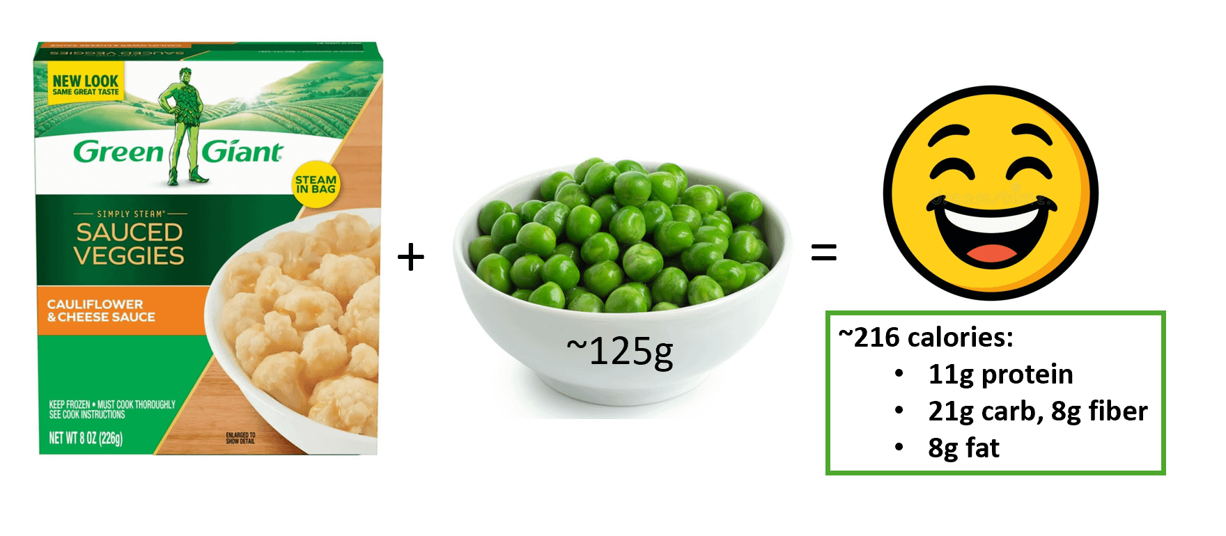 Cheesy cauliflower and peas is such a classic combination of flavor and texture, and there is more than enough cheese sauce to cover everything in the bowl. I'll sometimes increase the peas up to 165g, add a splash of milk, S&P, and the result is just as good. Cheap, easy, and busts a major craving!