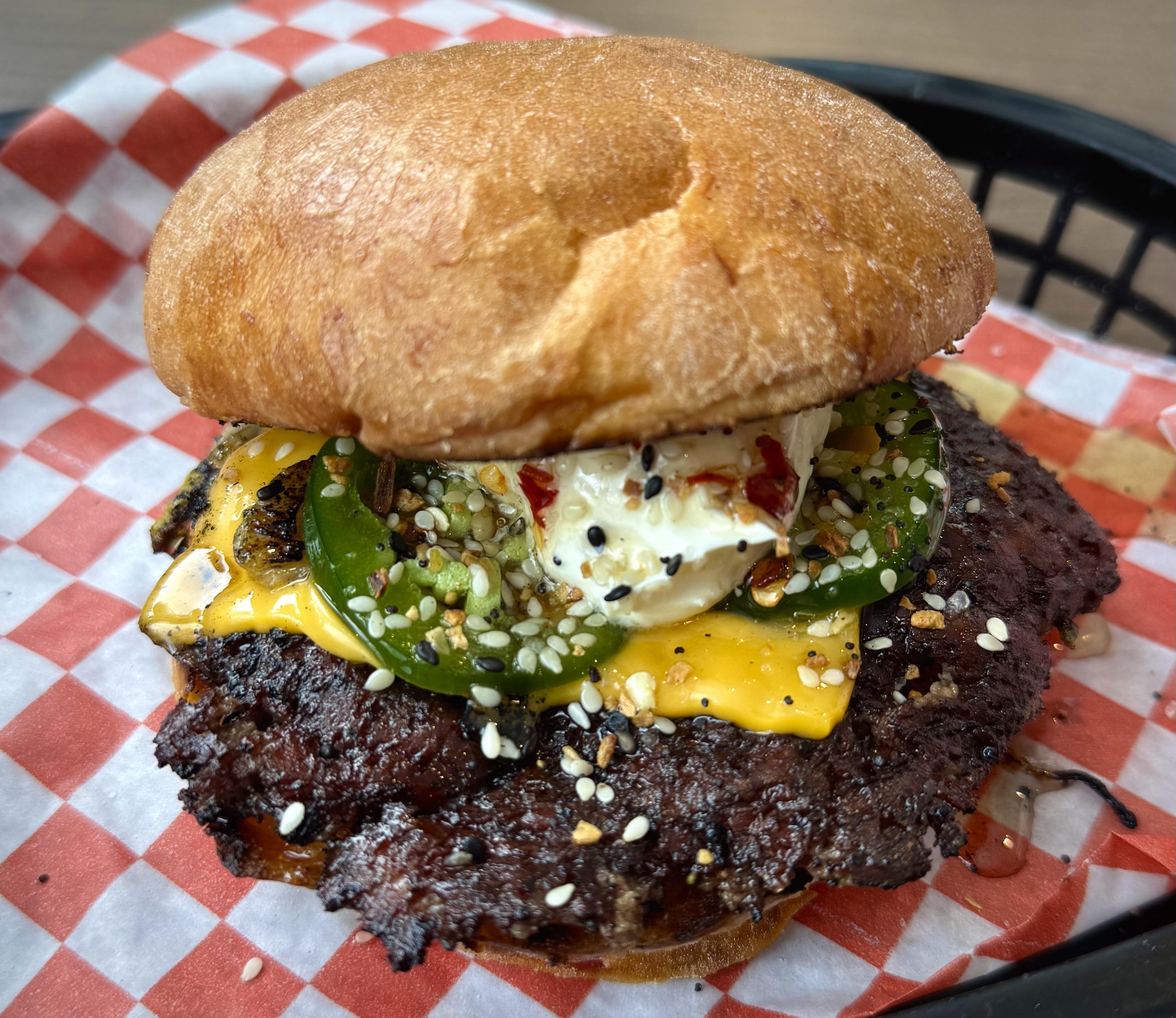 Smash patty, slice of American cheddar, jalapeños, cream cheese, everything bagel seasoning, hot honey. by TheJamBerge Food
