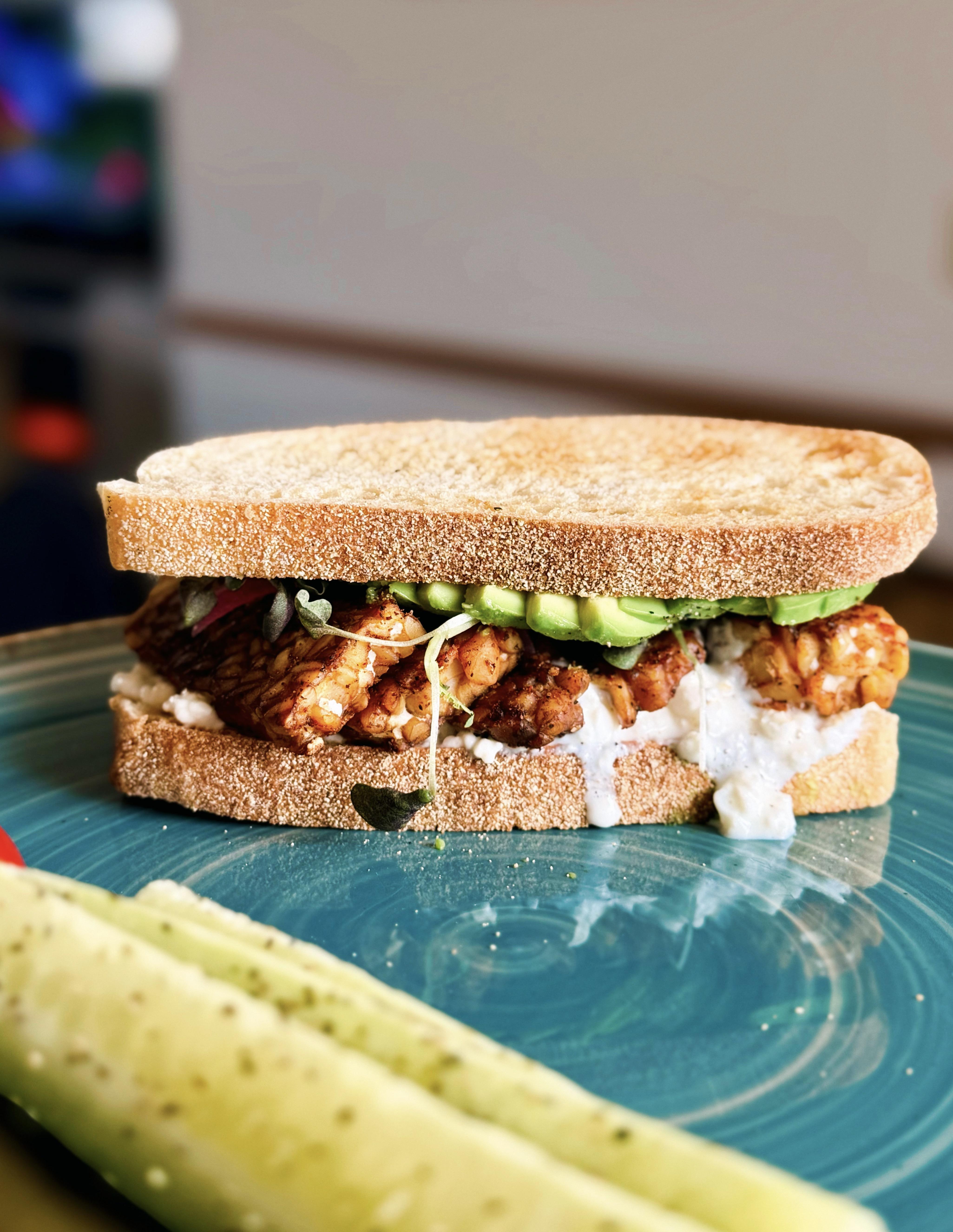 Tempeh, avo, cottage cheese, pickled red onion & sprouts