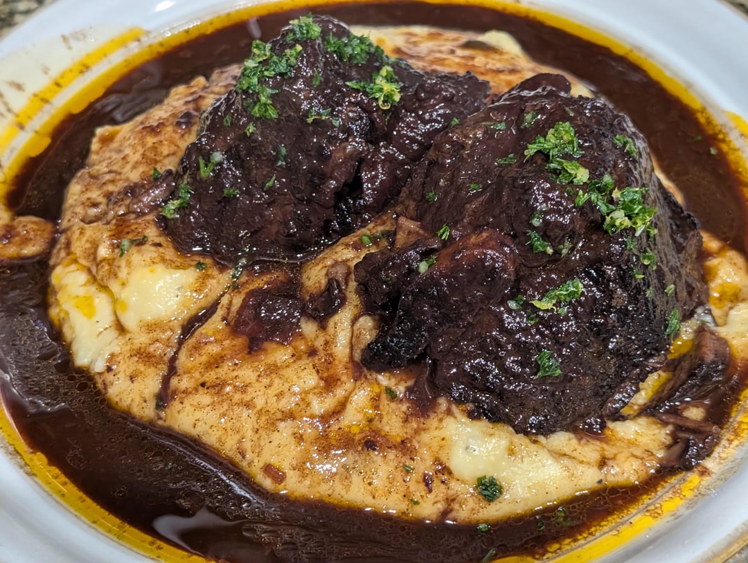 Looks really nice. I’ve personally found that if you fridge the cooking liquid overnight it’s very easy to remove the surface fat, which is pooling around the edge of your plate. Or you can just skim before serving to reduce that grease a bit. Either way, looks like it tasted great.