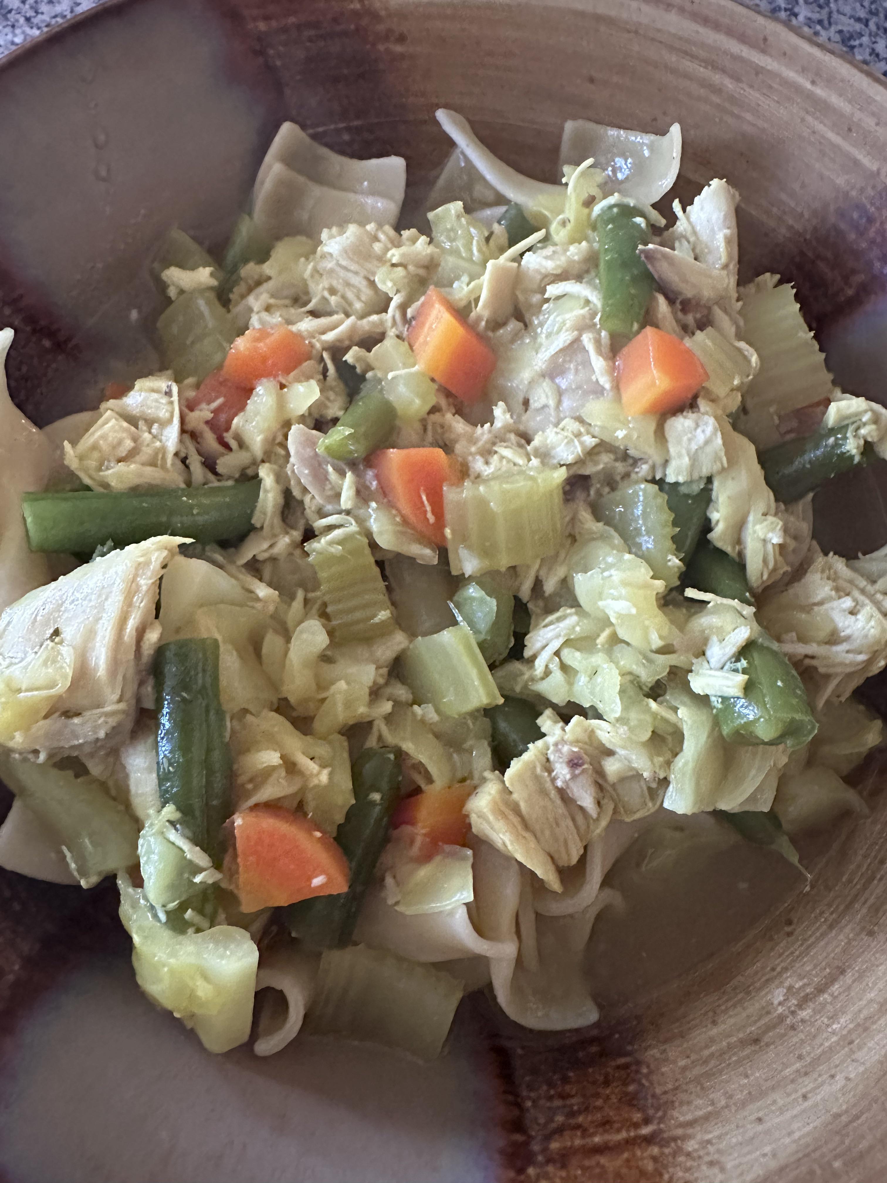 Into the stock added turmeric, carrots, celery, cabbage to cook about 15 min, once tender added green beans. Adjust seasoning. Serve over egg noodles. This is also great with a can of cream of whatever added.