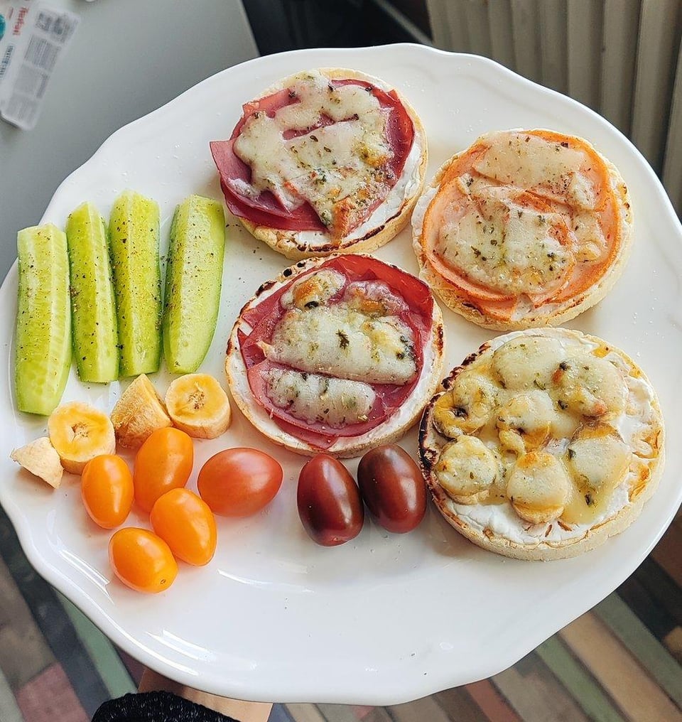 Lunch: Toasted chickpea ricecakes with cream cheese, meat & cheese. …And one with banana… My cravings are an enigma…