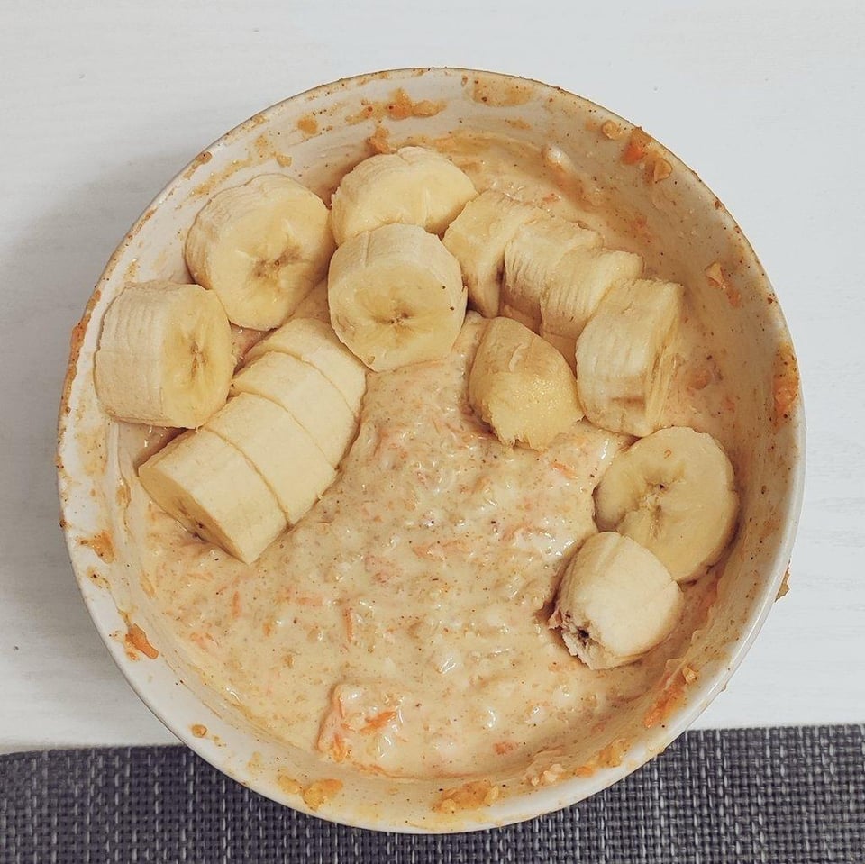 Breakfast: Overnight oatmeal with carrot & banana. (I totally forgot about protein here xD but these oats were soaked overnight x2, so they were extra gut-and-GI friendly and I felt great after eating them!)