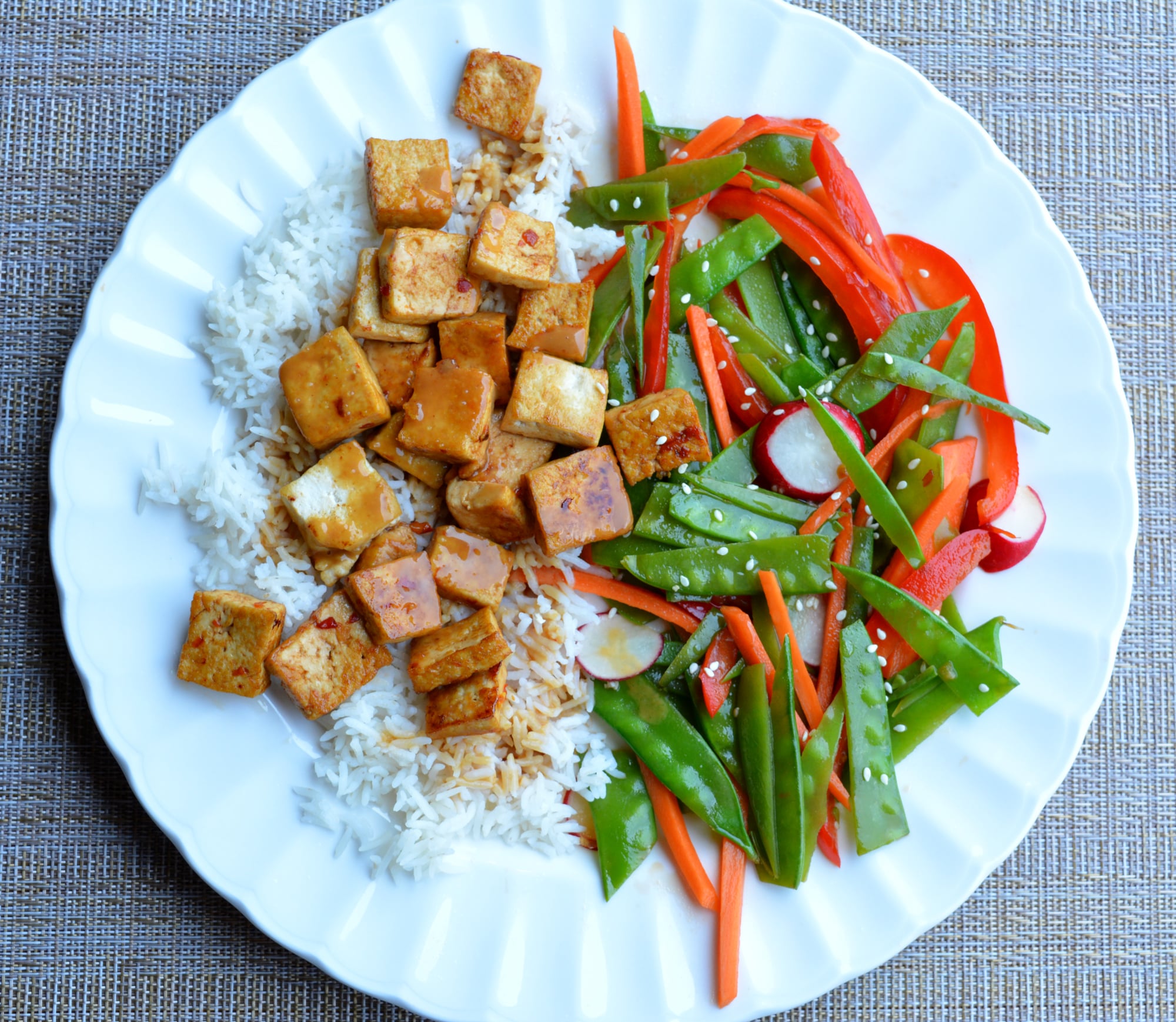 Tofu was pan fried with a little soy sauce + chili sauce added for color/flavor