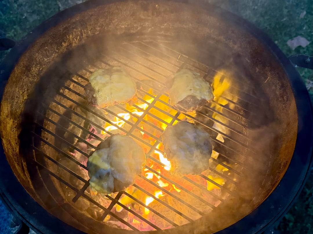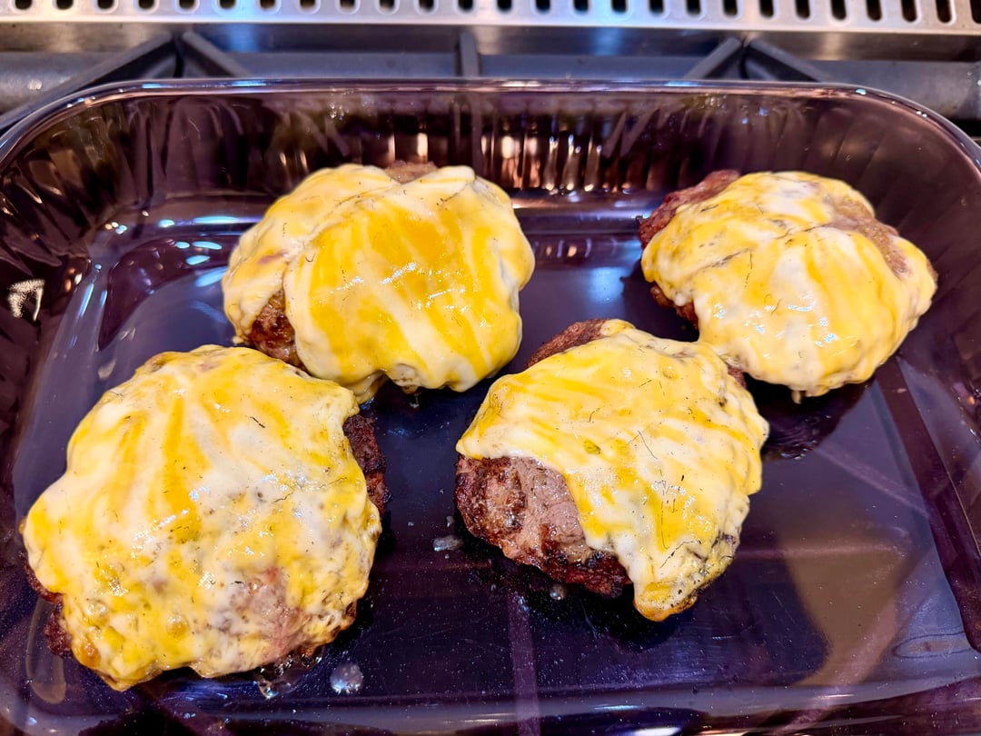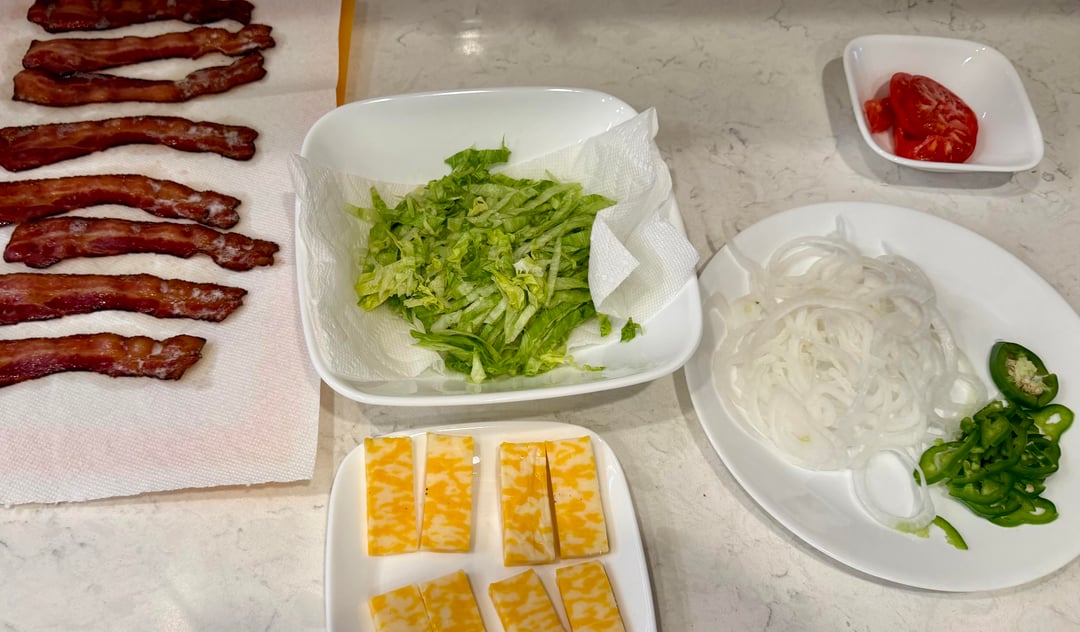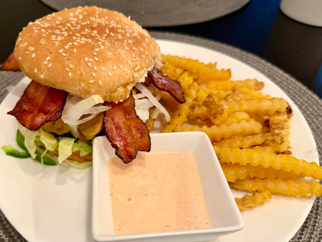 Grilled bacon cheeseburgers with crinkle fries and fry sauce [homemade]