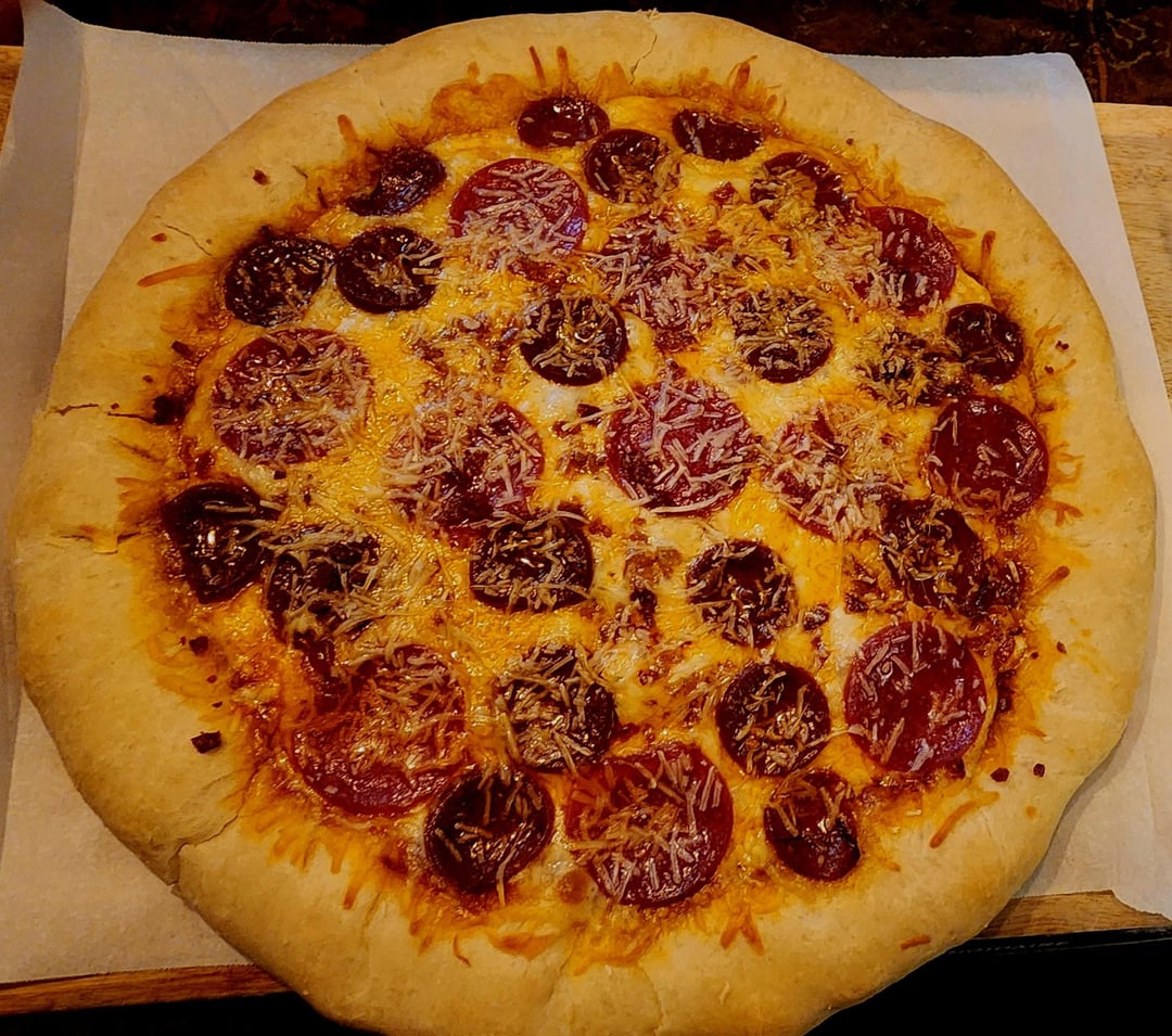 Made stuffed crust pizza from scratch for dinner. Hard salami, the fancy pepperoni you have to slice yourself, bacon, mozzarella, provolone, and parmesan cheese on homemade dough.