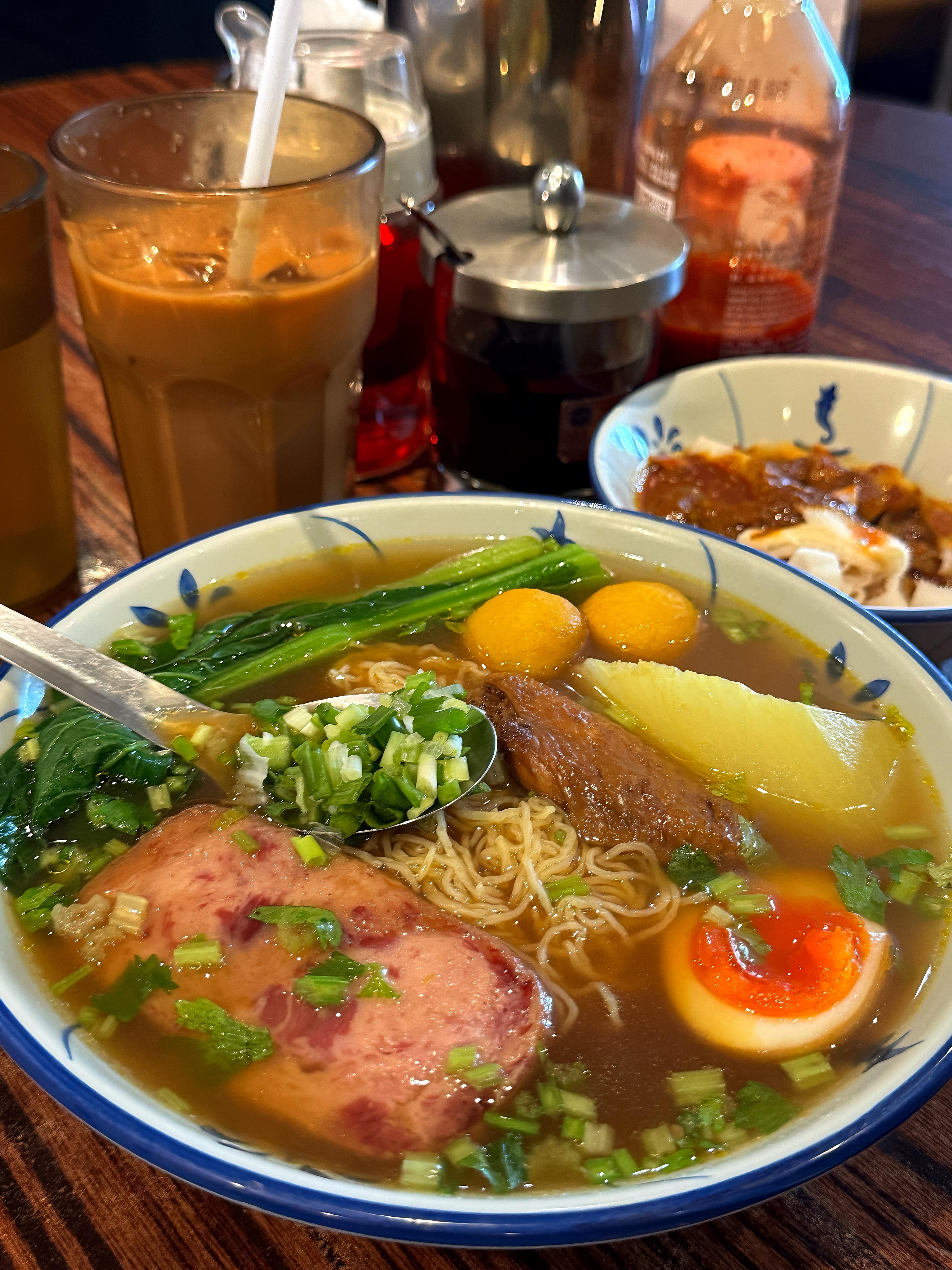 This is a classic Hong Kong street food combo. The broth is really rich and the milk tea is super smooth.