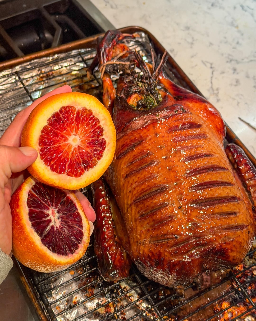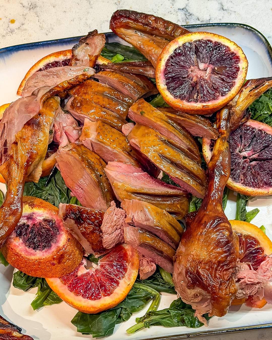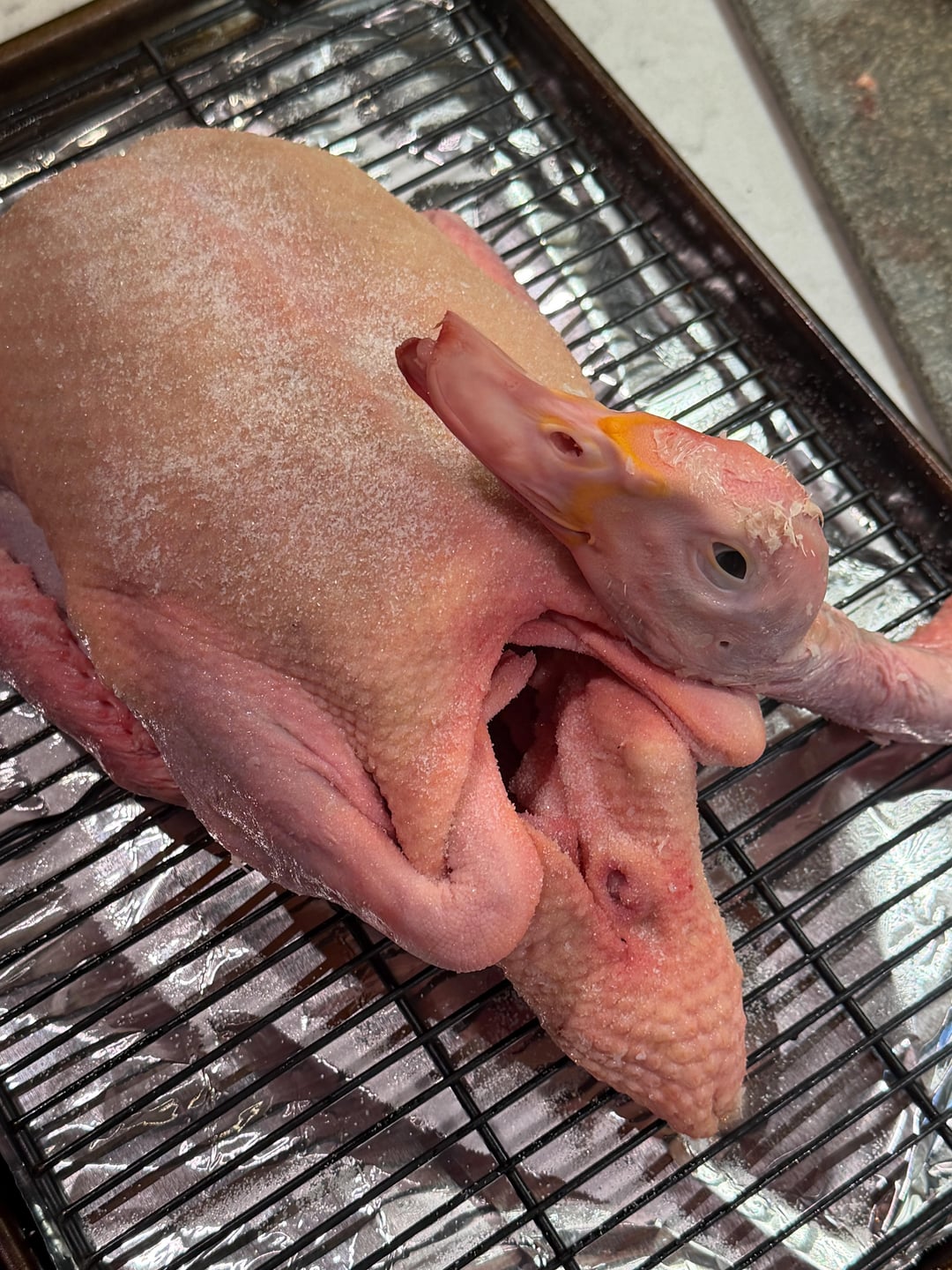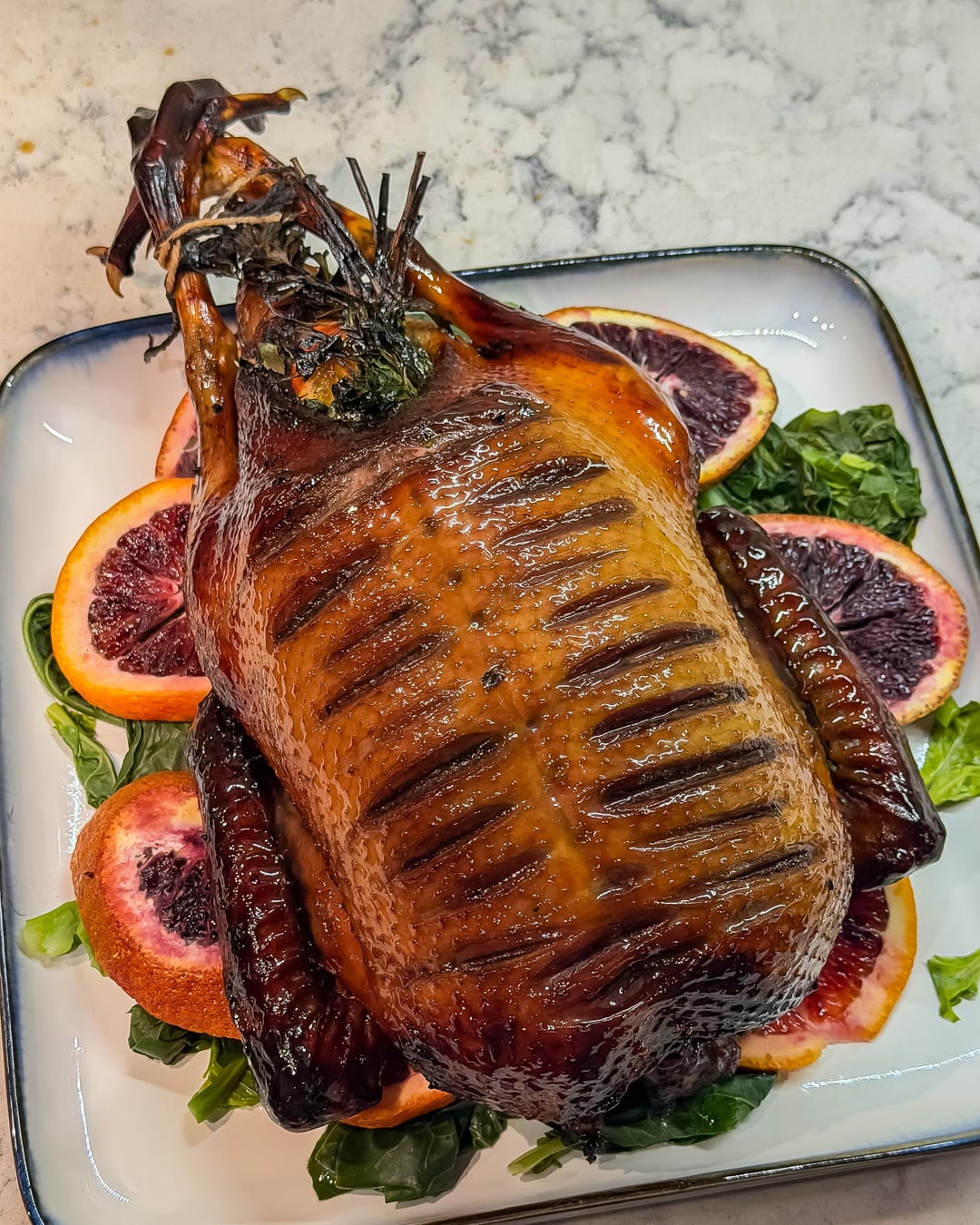 Local Asian market had some beautiful Muscovy ducks. This fine 6lb specimen was only $30USD. After a five hour dry brine I hit it with homemade orange glaze and roasted slowly for about two hours, basting often. Result was crisp, sticky, shiny skin and wonderfully flavored duck. Prepared a separate orange sauce and went to town with some Chinese broccoli and roasted potatoes. 🦆🙌🏻✌🏻
