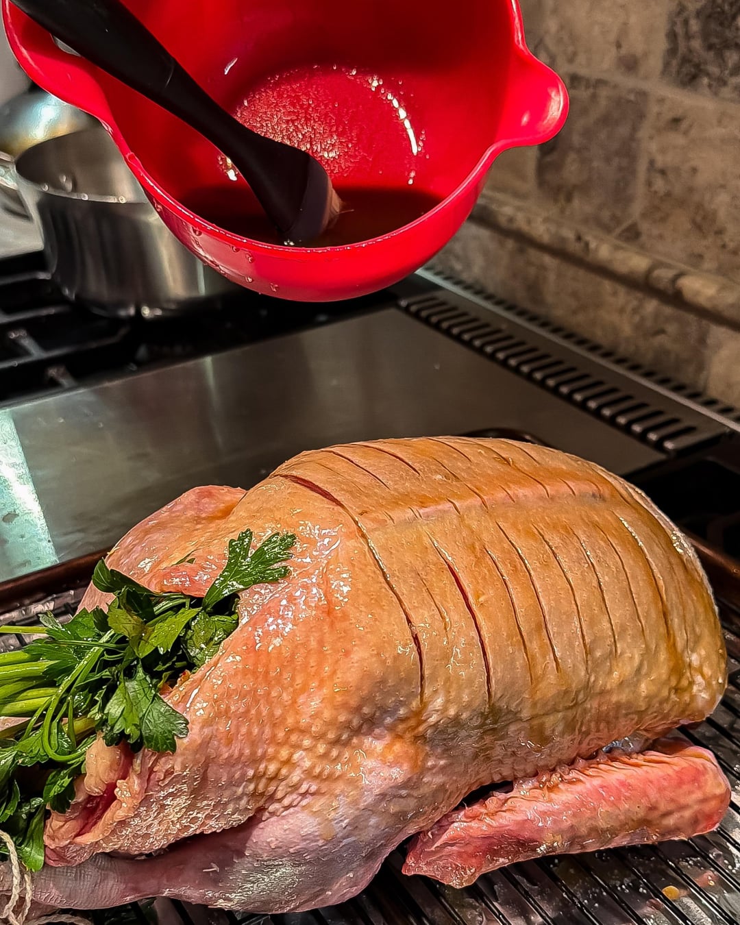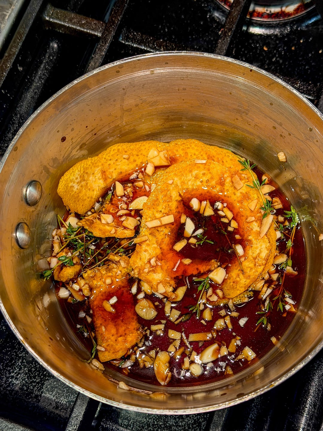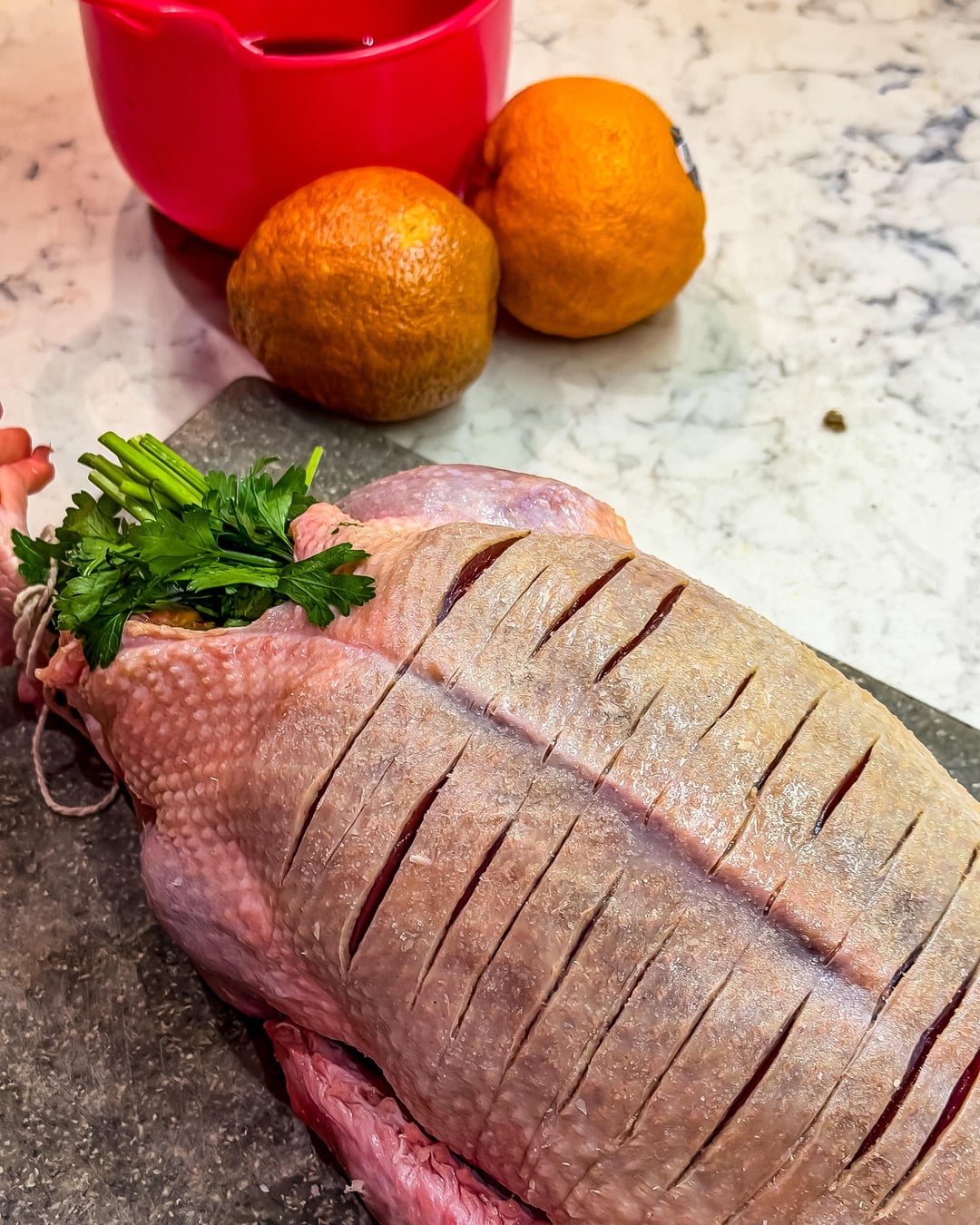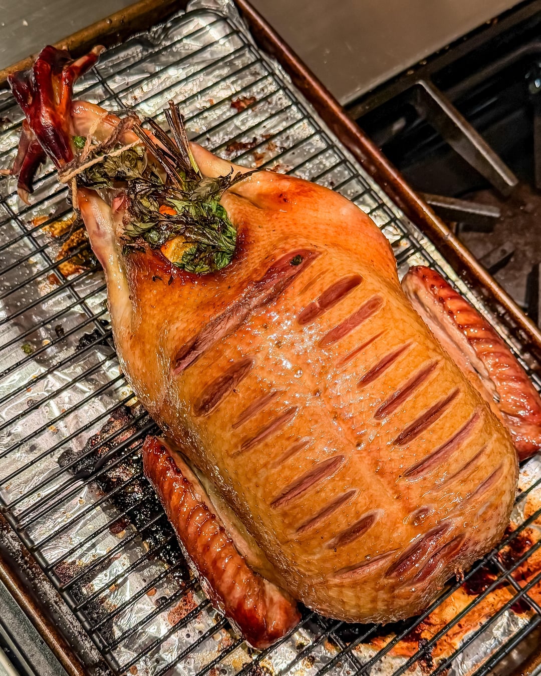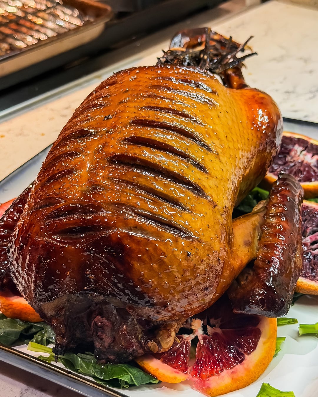 Local Asian market had some beautiful Muscovy ducks. This fine 6lb specimen was only $30USD. After a five hour dry brine I hit it with homemade orange glaze and roasted slowly for about two hours, basting often. Result was crisp, sticky, shiny skin and wonderfully flavored duck. Prepared a separate orange sauce and went to town with some Chinese broccoli and roasted potatoes. 🦆🙌🏻✌🏻