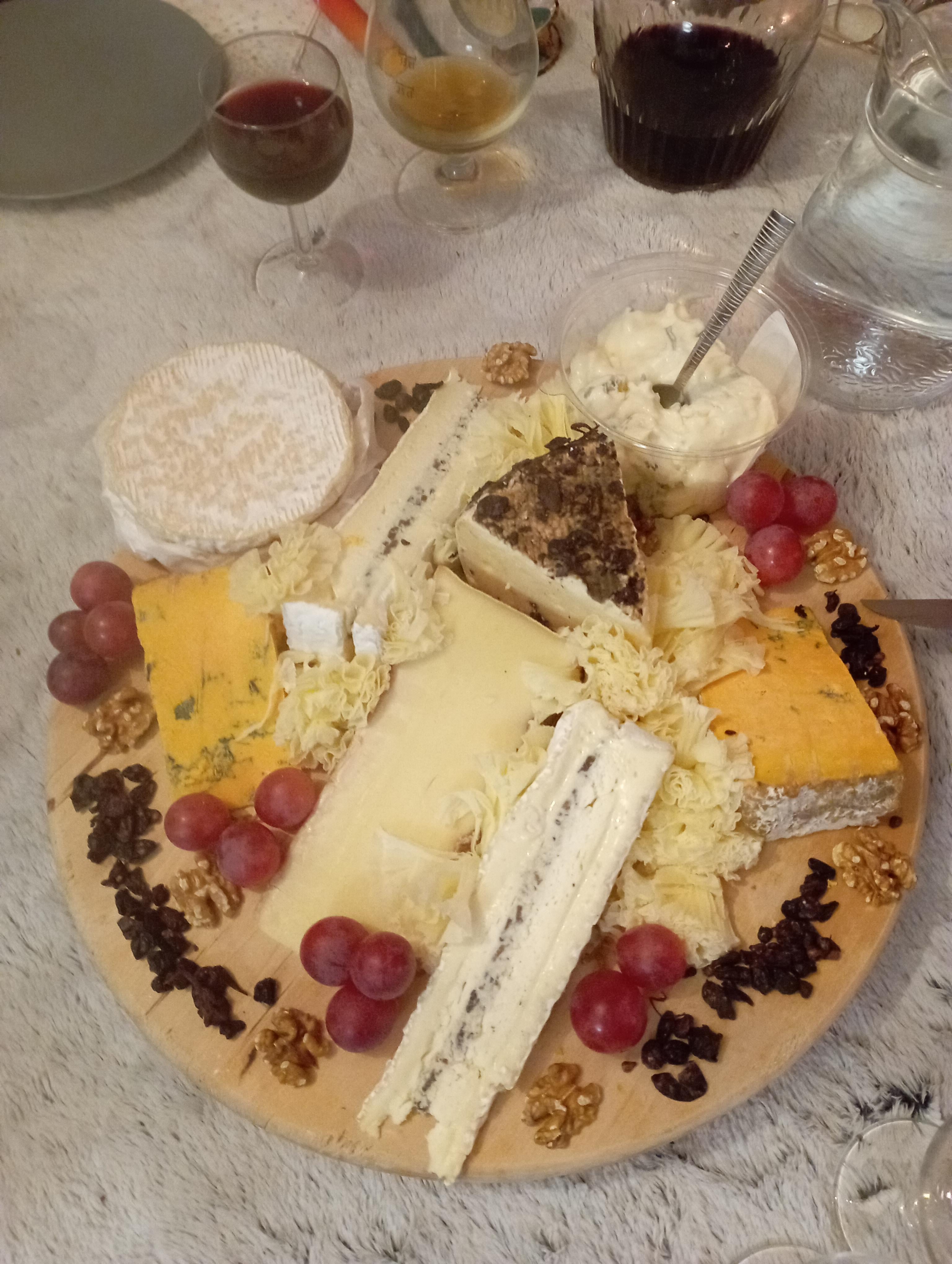 Top to bottom is Gorgonzola, Camembert de Normandie à la truffe, Tomme au marc de raisin, Brie des Meaux with a truffle stuffing that I made, Abondance fermier, Shropshire blue, and between the wedges are Tête de Moine shavings. The plate was empty in about 15 minutes