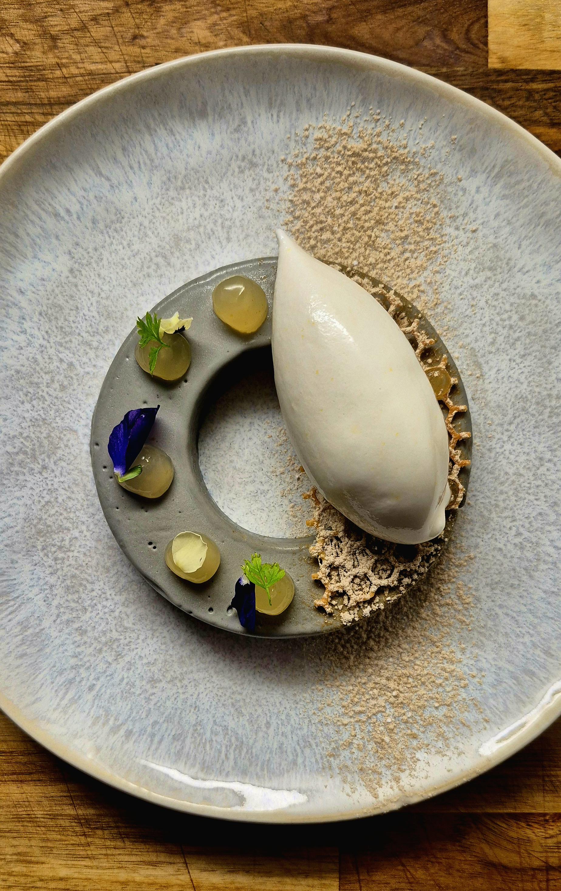 Liquorice Mousse with Lemon Sherbet, Lemon Gel and Tuile