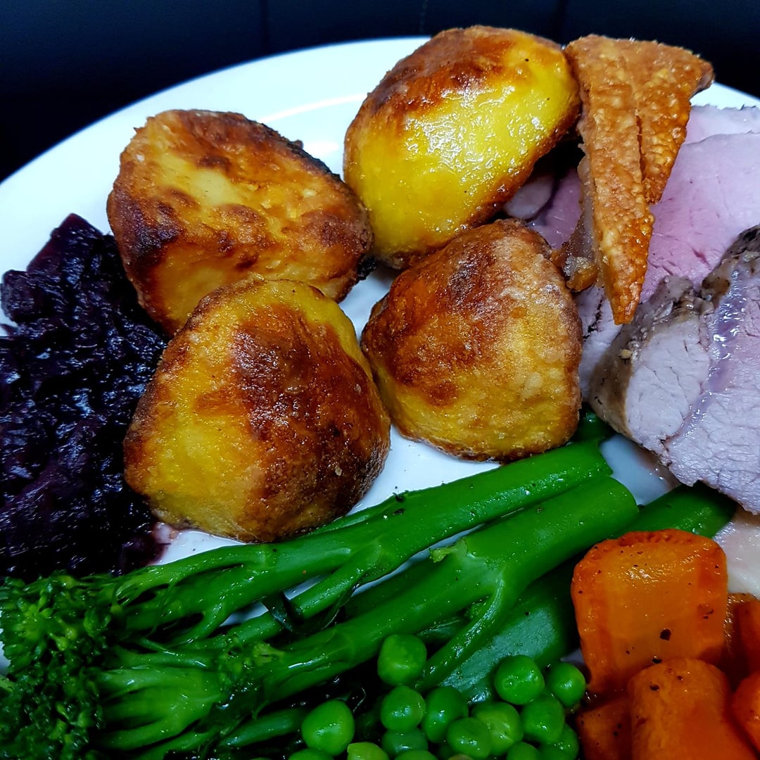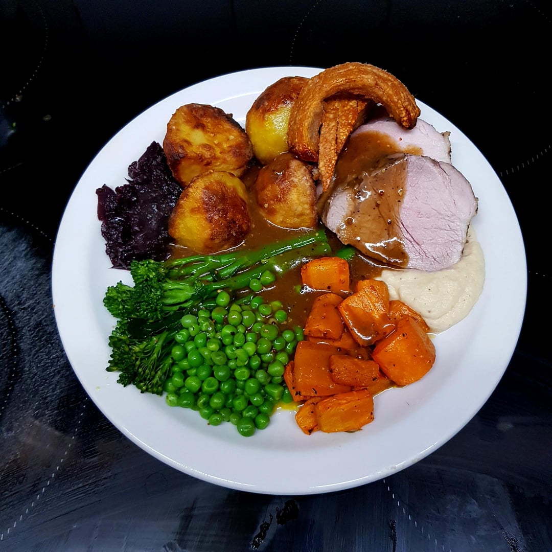 Roast Pork, Duck Fat Potatoes, Honey Carrots, Braised Red Cabbage, Buttered Broccoli and Peas and Roasted Cauliflower Puree. Cider Mustard Pan Gravy and Crackling.