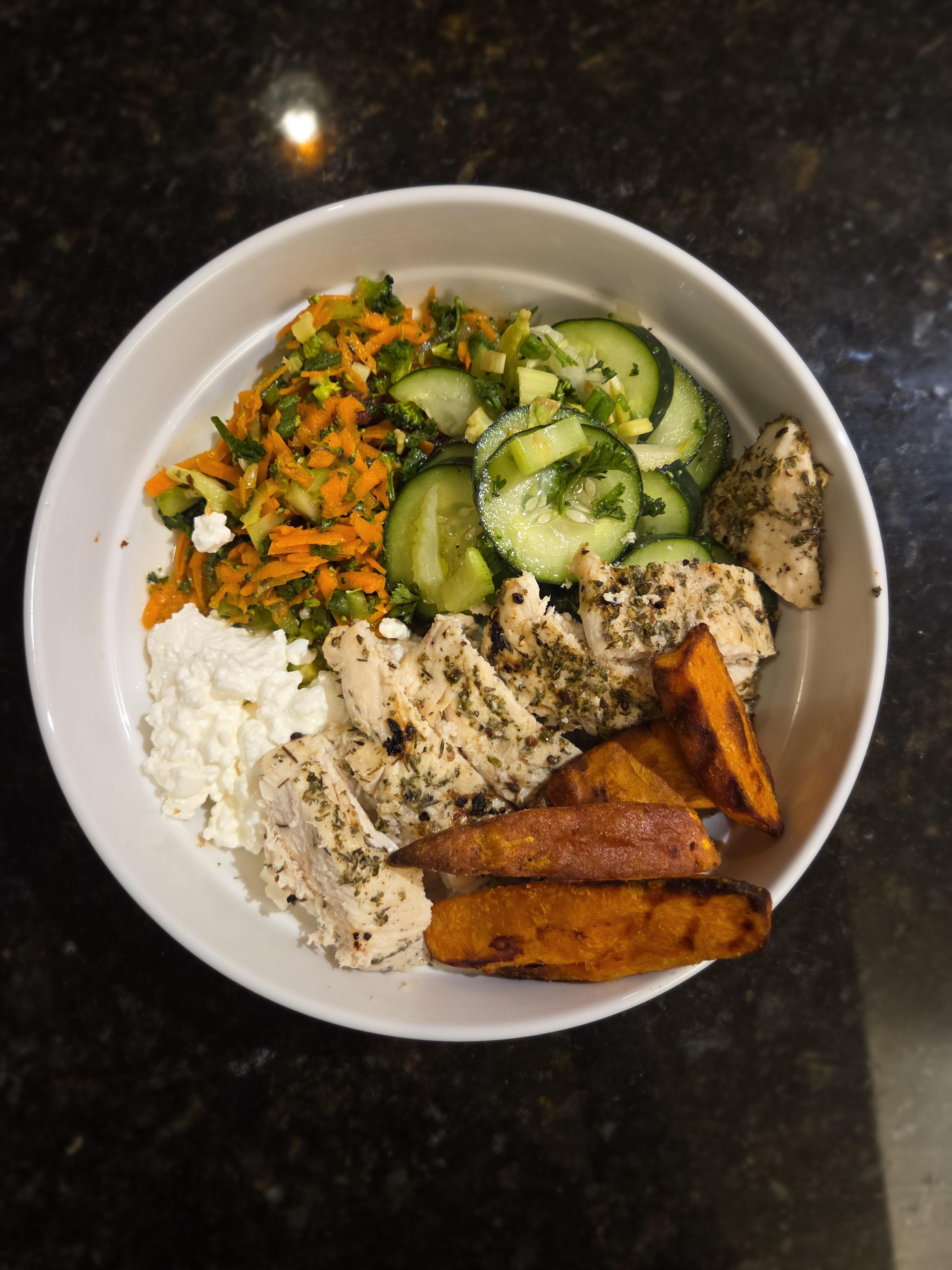 57g of protein from the chicken breast and cottage cheese. A couple salads I made earlier in the week, and some sweet potatoes. Not pictured but included in the calories is the one leftover roasted carrot I couldn't help but eat before snapping a picture lol.