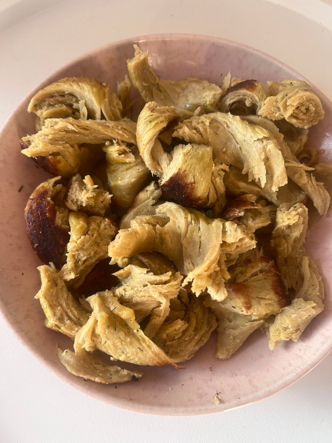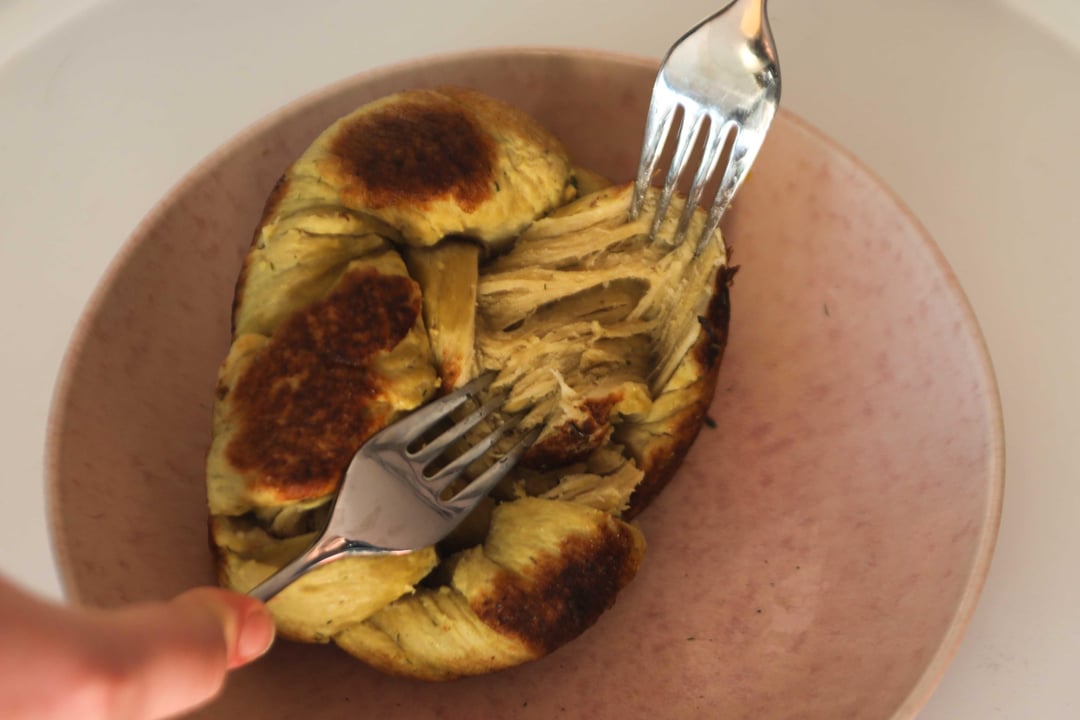 It’s just vital wheat gluten, hummus, soy milk, and vegan chicken flavoring (bullion)