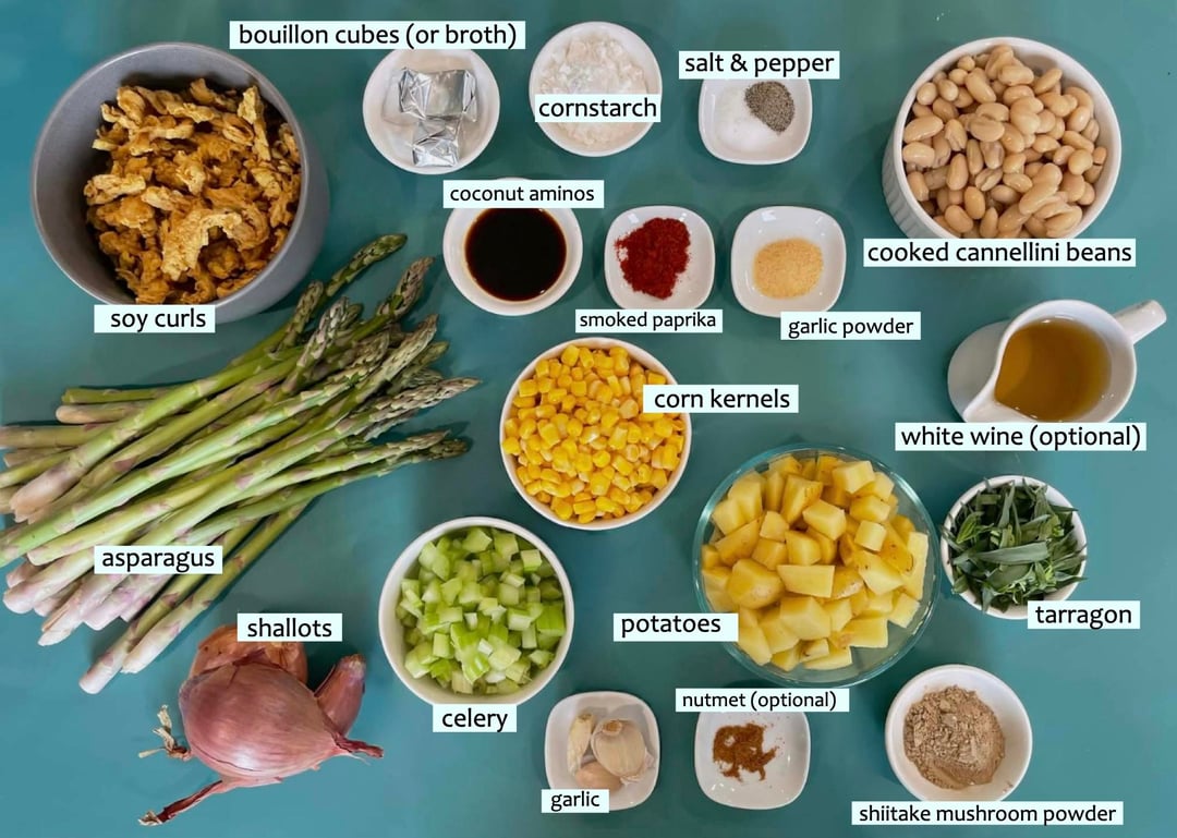 I guess I hadn't realized how healthy and minimally processed soy curls are. This stew has no added oil. To get the right flavor and texture I soaked the in Not-Chick'N broth with some coconut aminos in them and roasted them in the oven before adding them to the stew. I used fresh tarragon because it goes so well with asparagus and it's in season right now, but other herbs would work too.