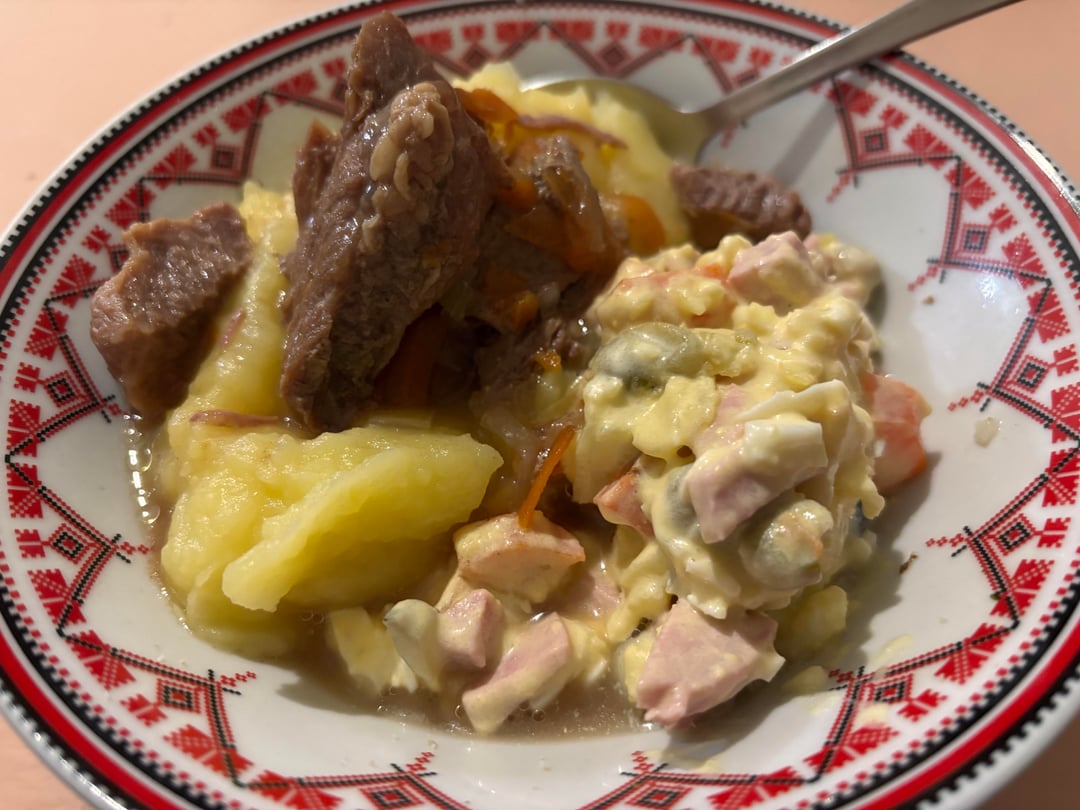 [I ate] Today’s lunch in my military unit somewhere in Ukraine: potato soup with meat, mashed potatoes with meat and Olivier type salad