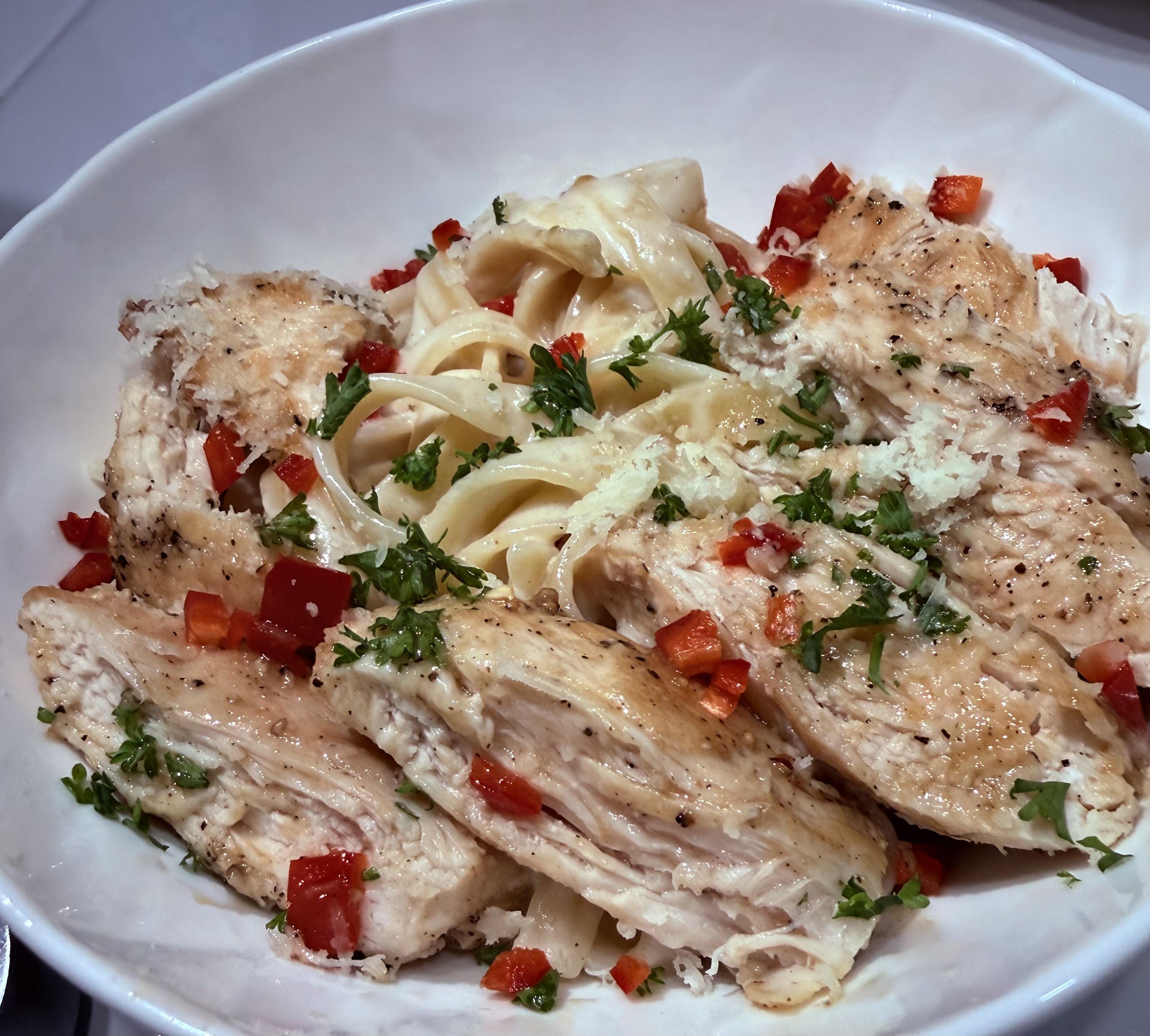 Homemade Chicken Alfredo with fresno chilies