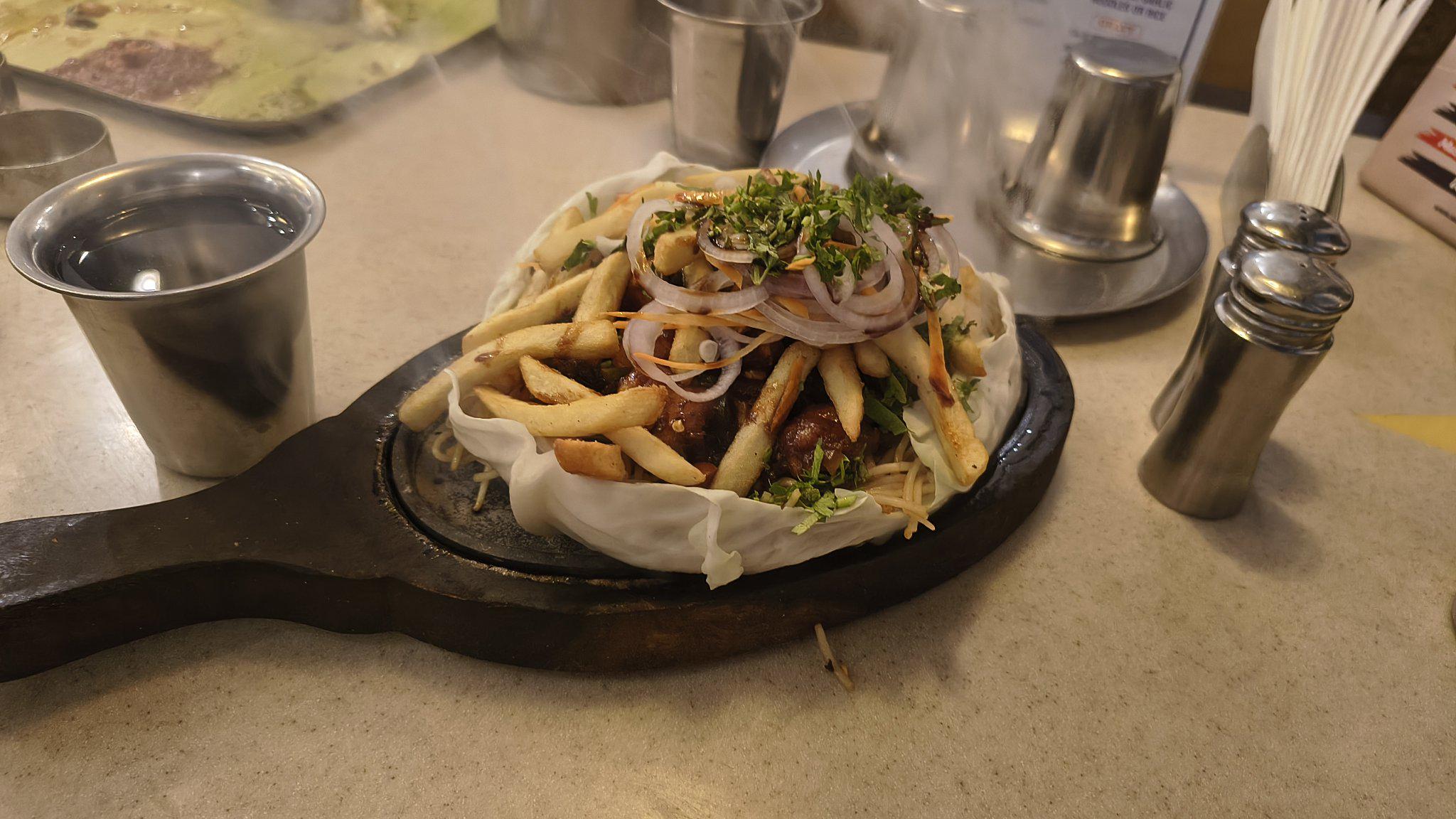 Sizzler of Cauliflower manchrian with mushroom noodles with Schezwan sauce with potato fries on top wrapped with a cabbage then sizzled😋🤤🤤🤤 Simply yum by Raman_917 Food Porn