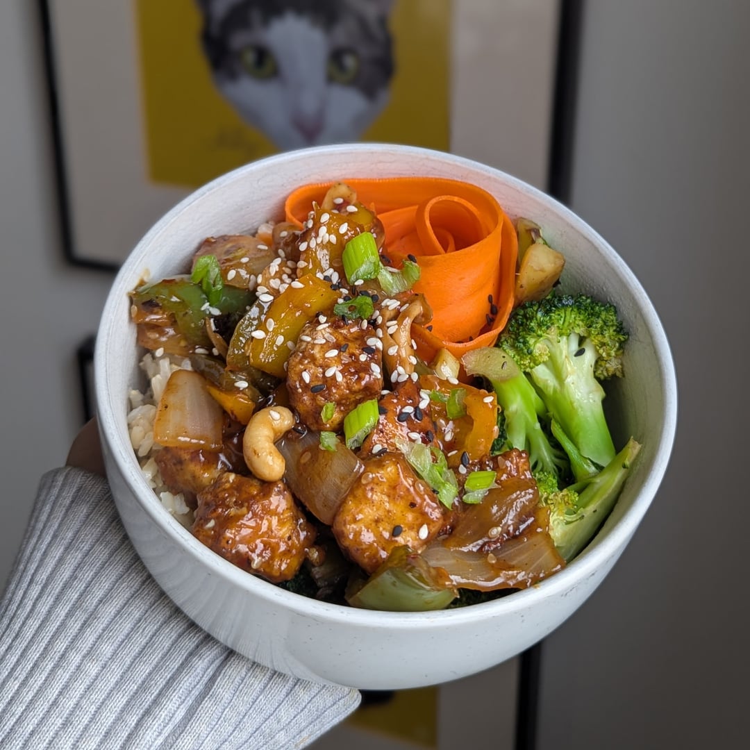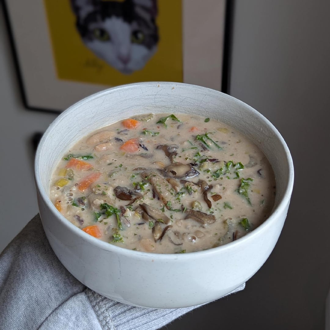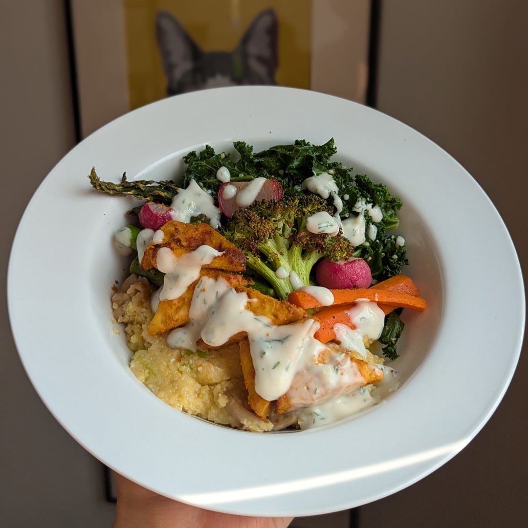 17.) Roasted spring vegetables and tofu on mushroom leek polenta.