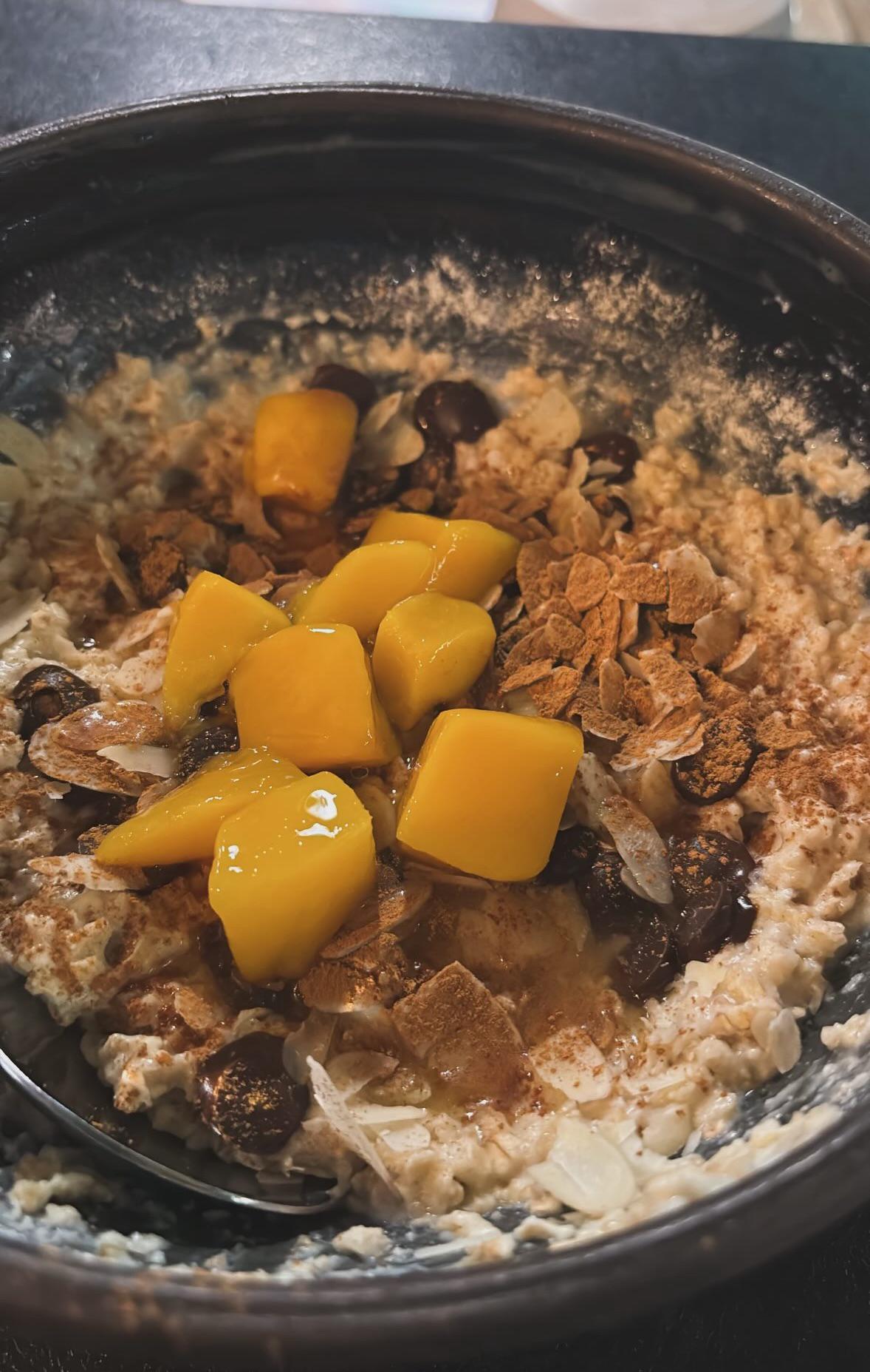 Porridge with mango, cinamon, whey, almonds and chocolate