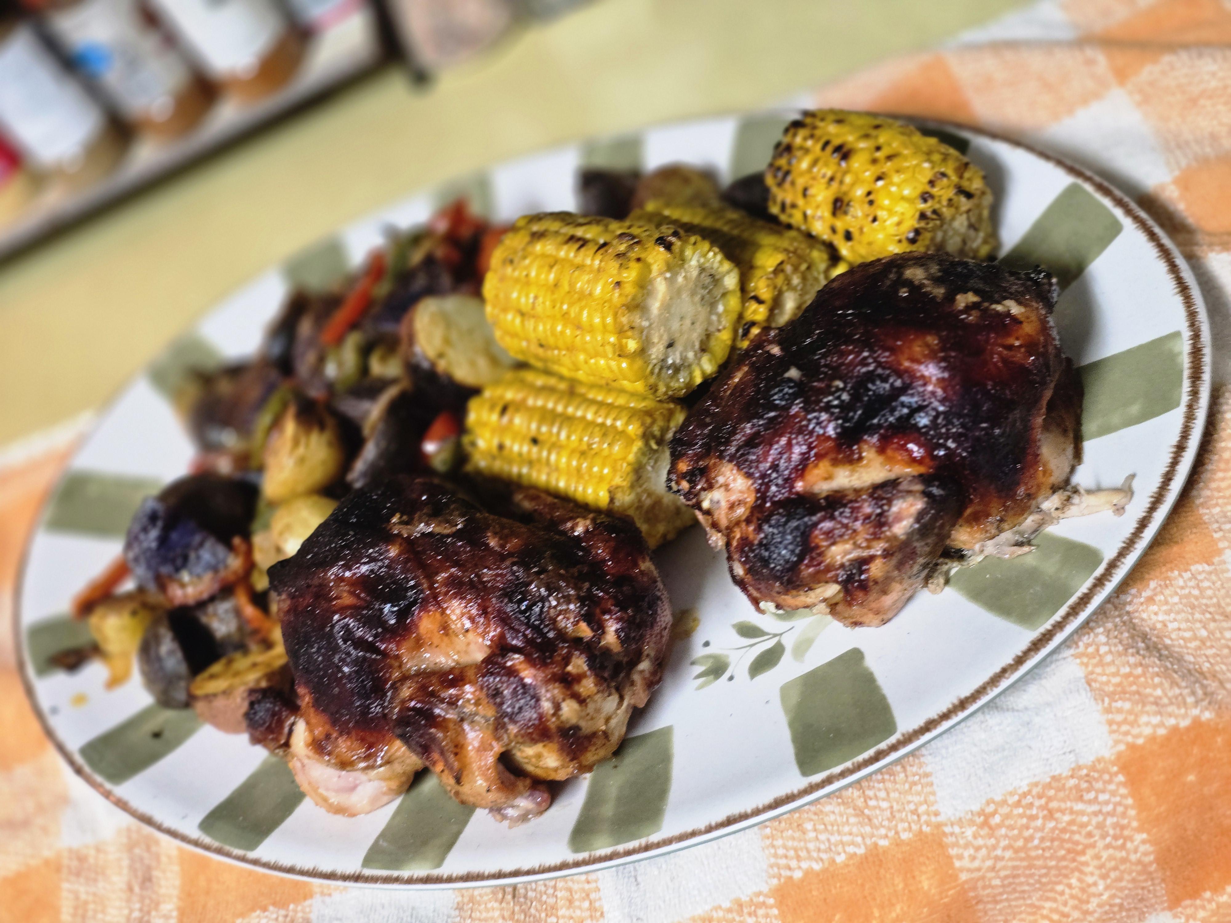 A dinner for two, roasted and smoked chicken, corn on the cob, and cowboy potatoes by jlmckelvey91 Food Porn