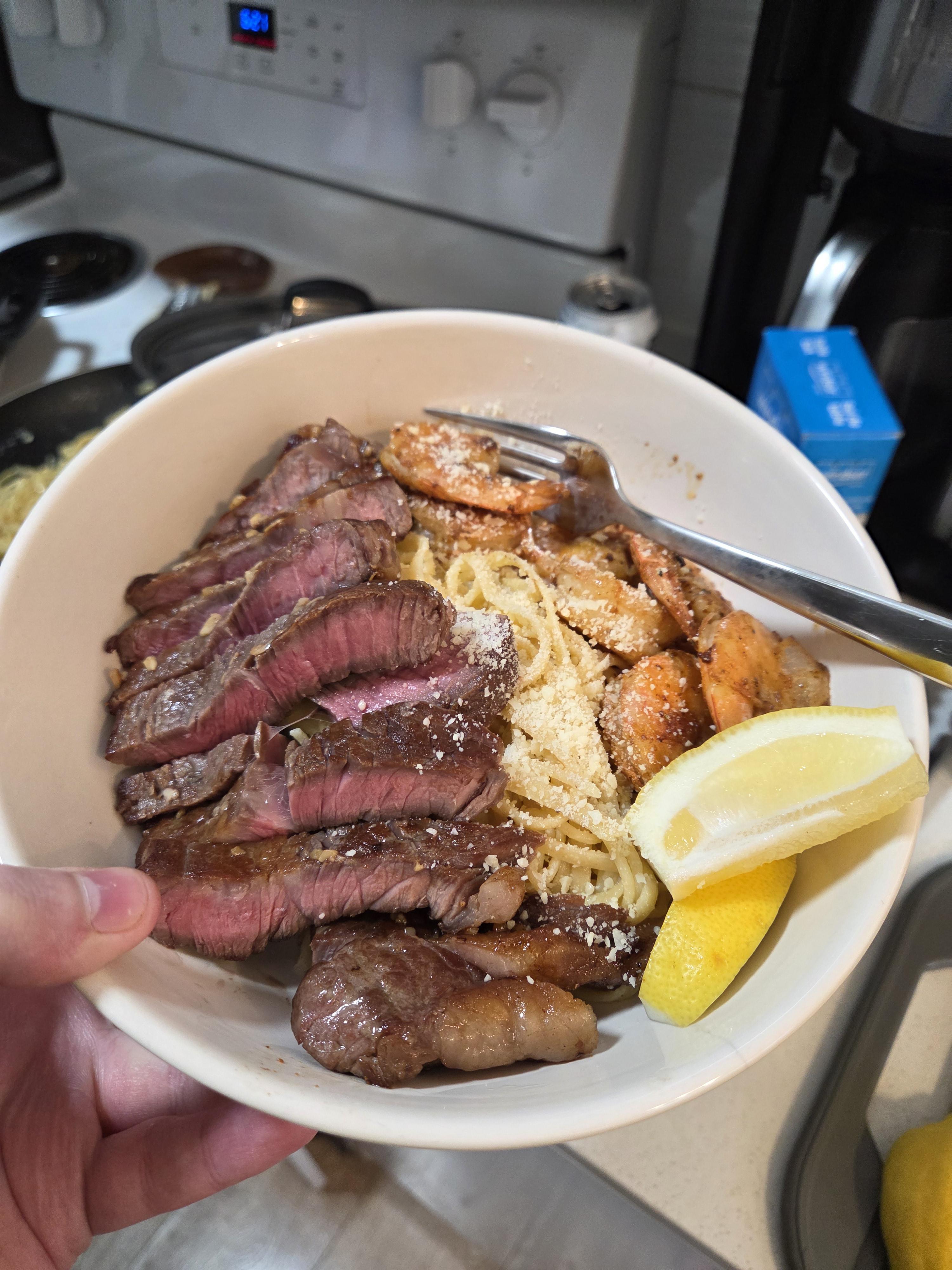Wife is out of town visiting her boyfriends parents so i made Striploin steak, Alfredo pasta and Cajun shrimp.