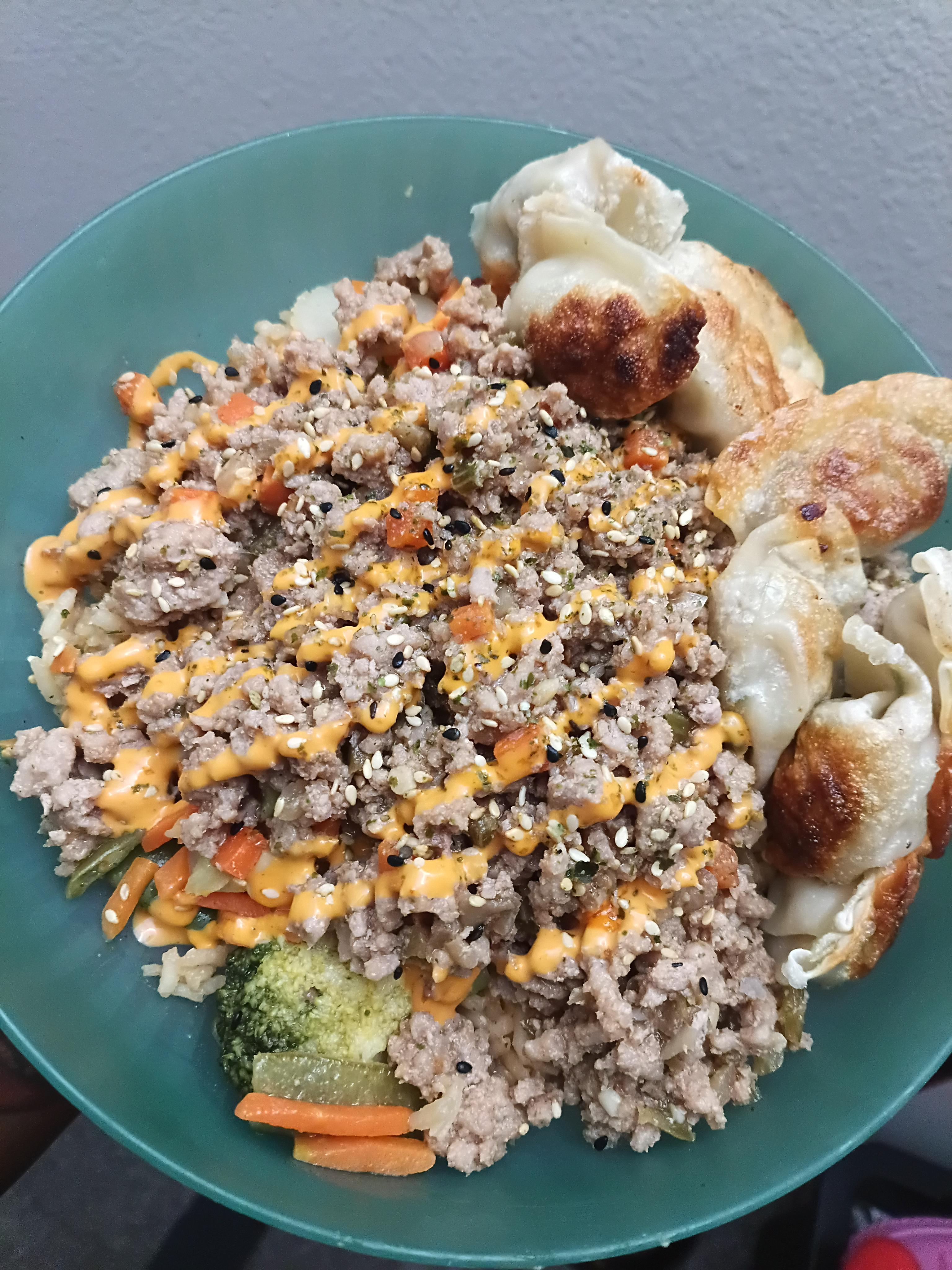 Turkey Bulgogi bowl w/ Stir Fry Veggies, White Rice and Pork Dumplings by Gloomy_Caregiver_669 Dinner Tonight Tonight's Dinner