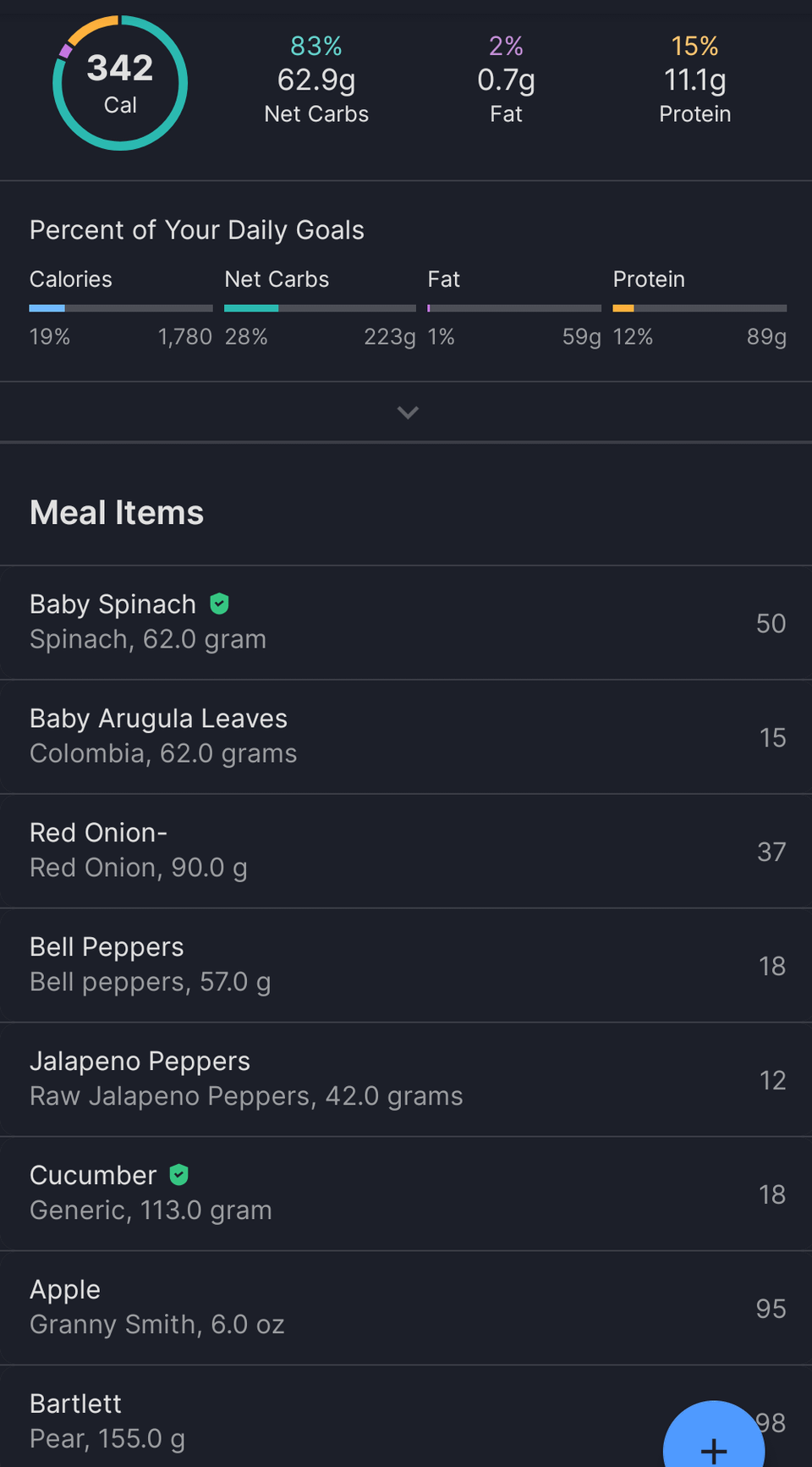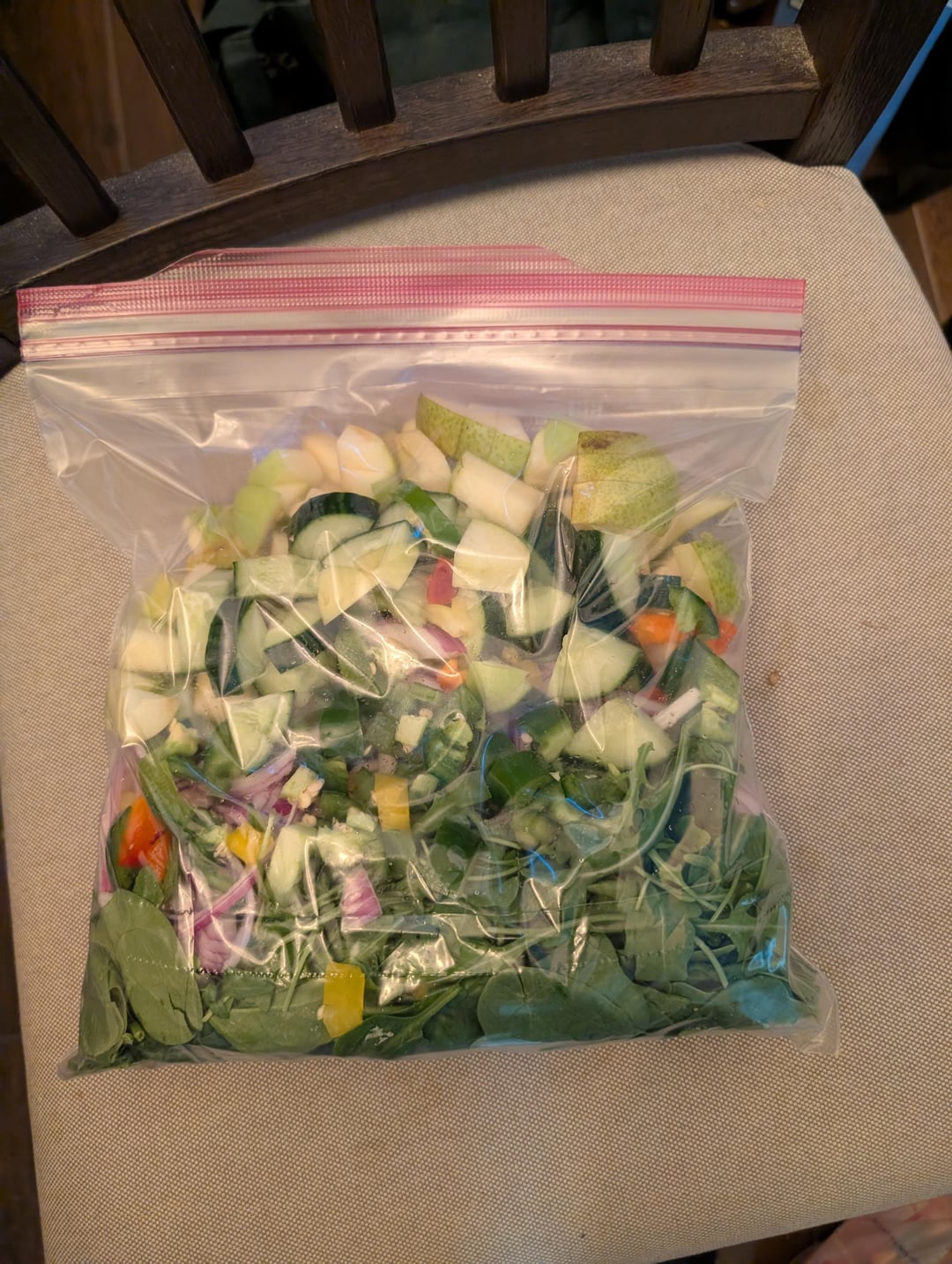 So, I was working on my meal prep for the week and had some spare time so decided to weigh out the ingredients as I prepped each of my salad baggies. Context: Every day I have about a gallon bag of salad to help me meet fiber, micronutrient, and satiety goals. I split this up among multiple small meals (right now, I'm bulking, so 6 meals a day of 300 cals / 20 g protein/ 5 g fiber each). Just the veggies and "stable" fruits in my salad every day (no cheese, berries, crunch components, meat, beans, pickles veggies, dressing, etc) is apparently 350 calories! Even cutting out the fruits, it's 150 calories. Youch!!