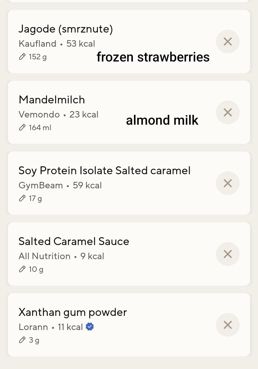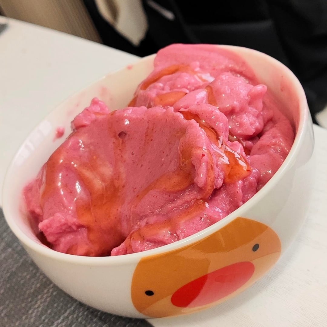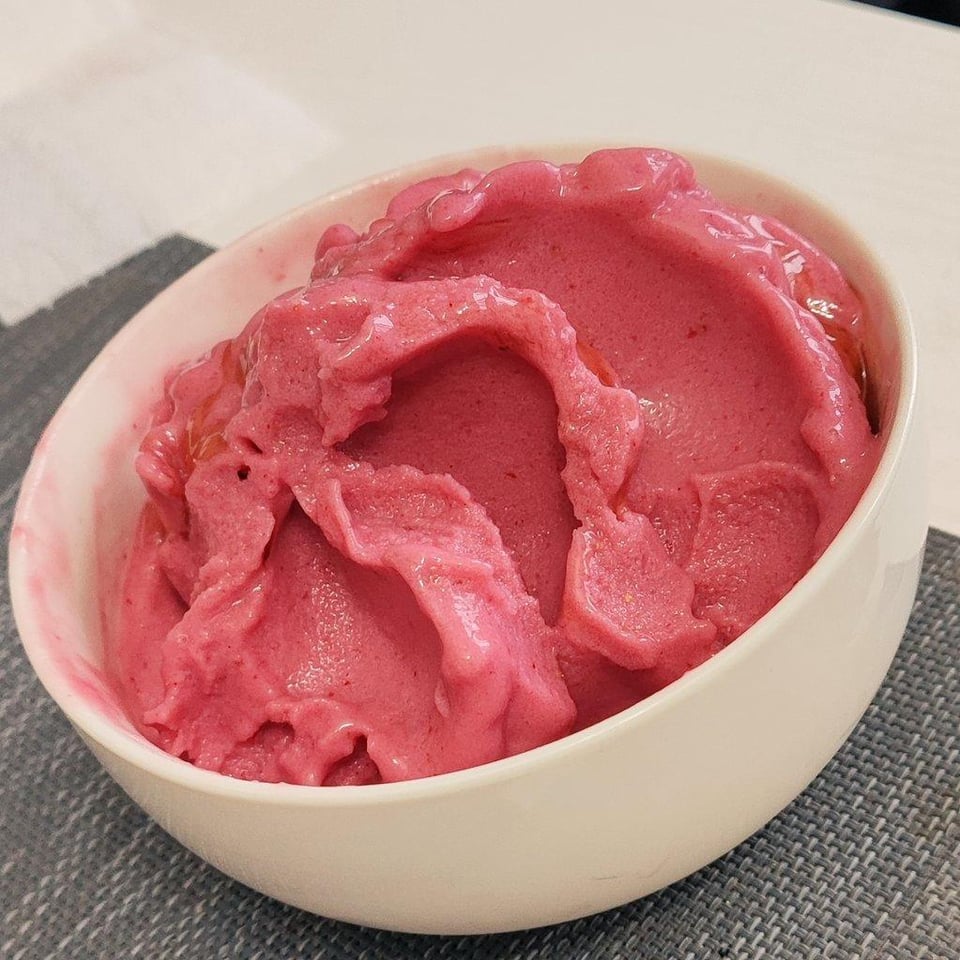 So I started out by blending the berries, ice and milk. Basically the blender struggles a lot but What I do is: be patient lol. I just turn it on, let it blend for a couple seconds as much as it can (even if it's not turning it all), turn it off, shake it up, and repeat as often as I have to… I added a bit of water in the process, but it was only about ~40ml total I'd say. Now the thing even if it looks like it's not doing anything it actually is. By the end, as you can see, my nice cream was totally smooth, but when I looked at the blender it wasn't turning at all. I added the soy protein somewhere in the middle of the process and the xanthan gum near the end. Warning it absolutely takes a while haha but it's worth it imo!