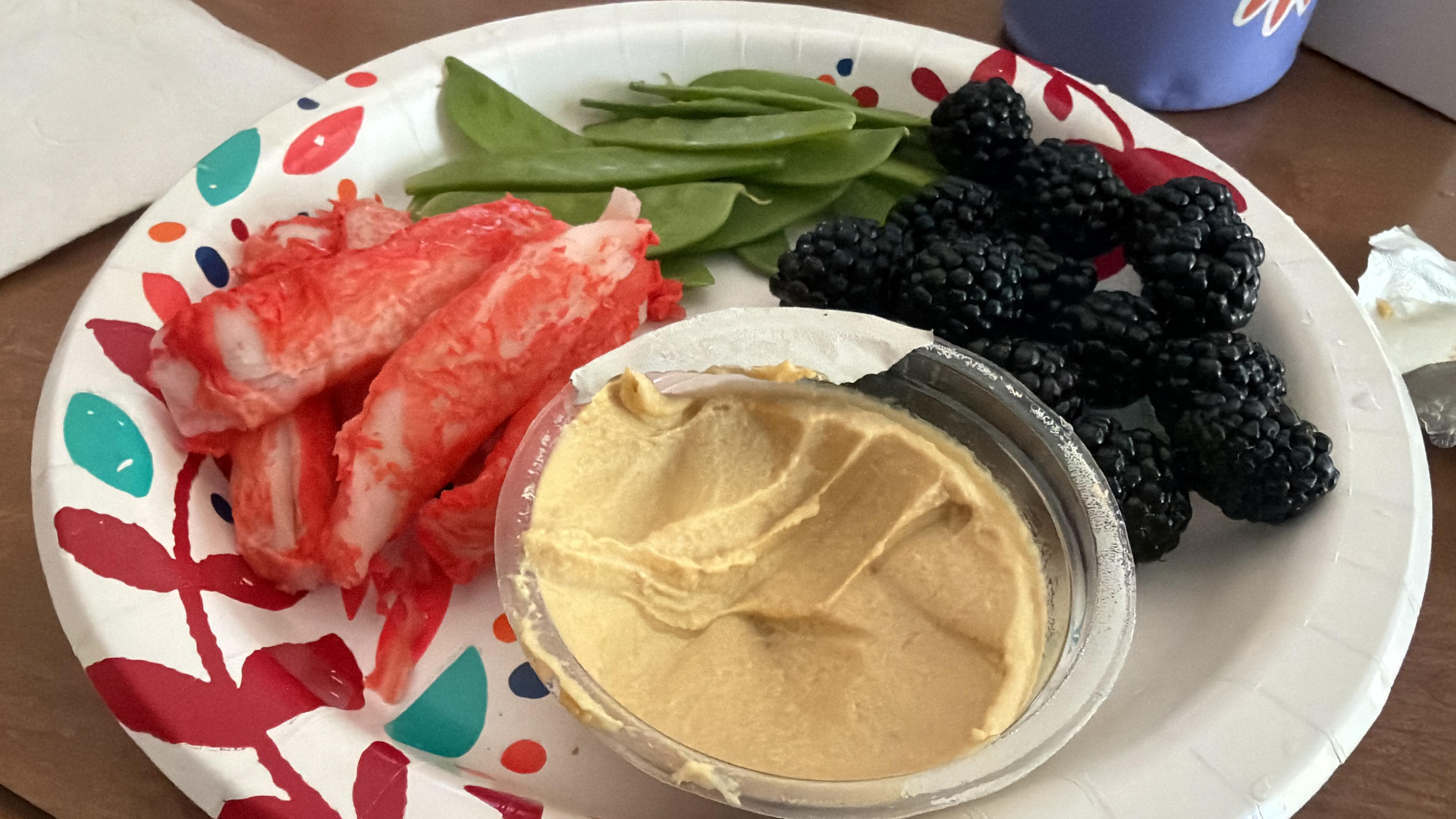 8oz Surimi, 1/4 cup hummus, 8oz snow peas (I prefer sugar snap peas but they were out, I ended up eating the whole bag), 5oz blackberries.