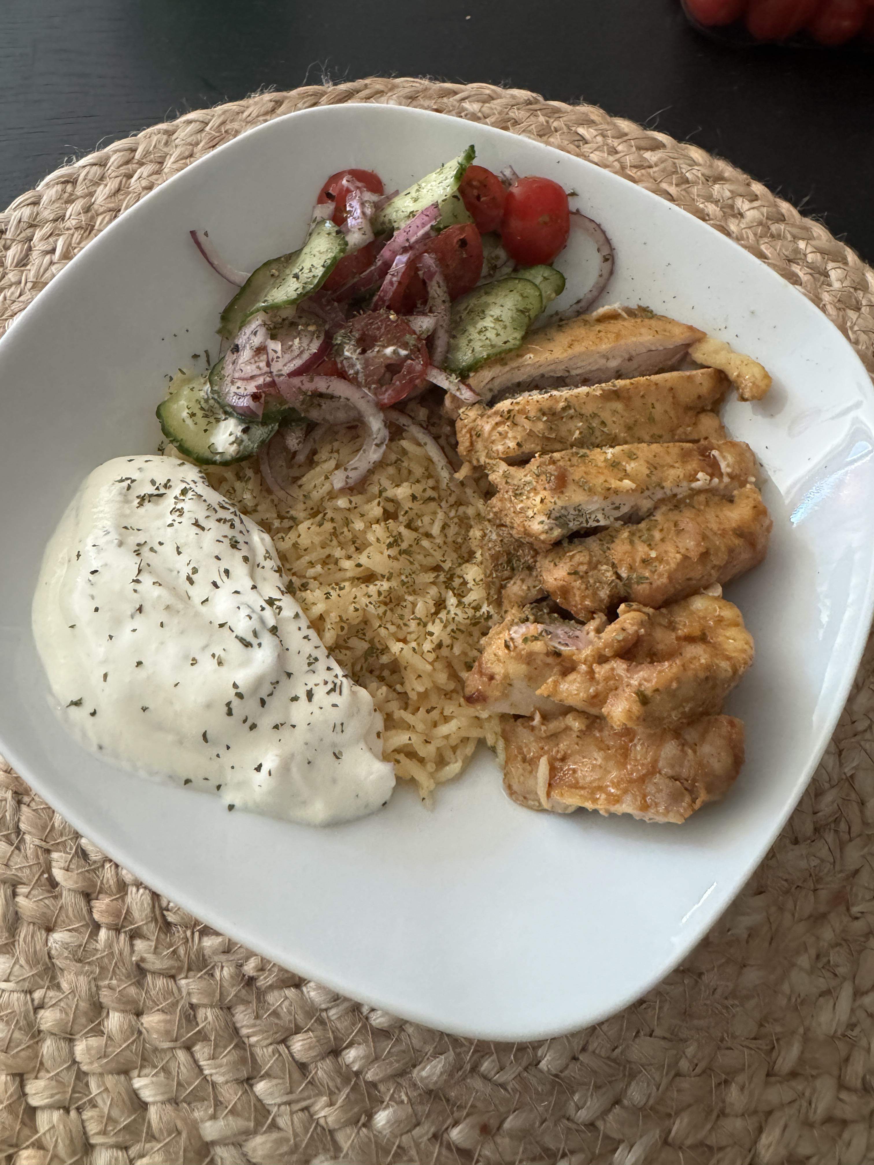 Chicken, rice a salad and a yoghurt garlic sauce. by Bonusmotherthrowaway Dinner Tonight Tonight's Dinner