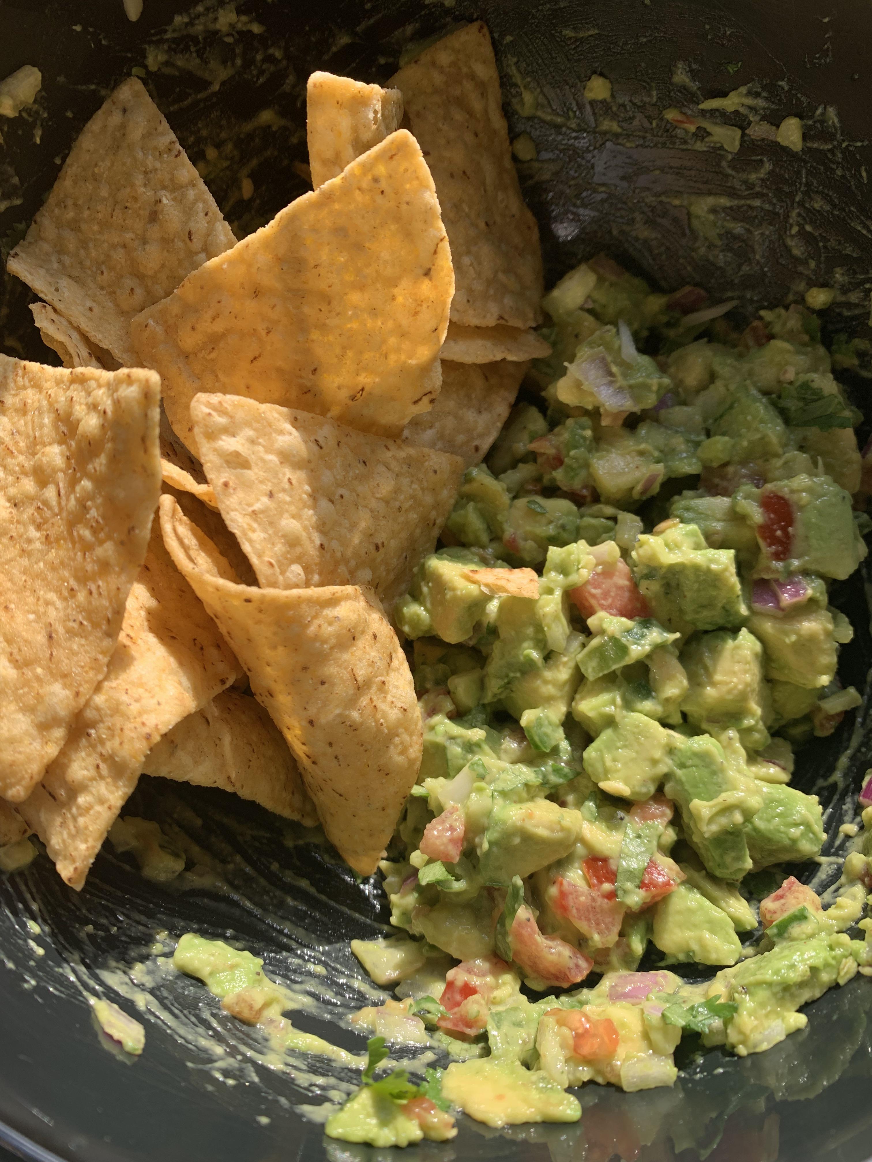 1. 1 avocado, 0.25 red onion, 0.25 sweet onion, garlic, cilantro, 0.5 jalapeño, fresh squeezed lime juice, 0.5 Roma tomato, & some onion garlic seasoning I bought at Marshall’s yesterday