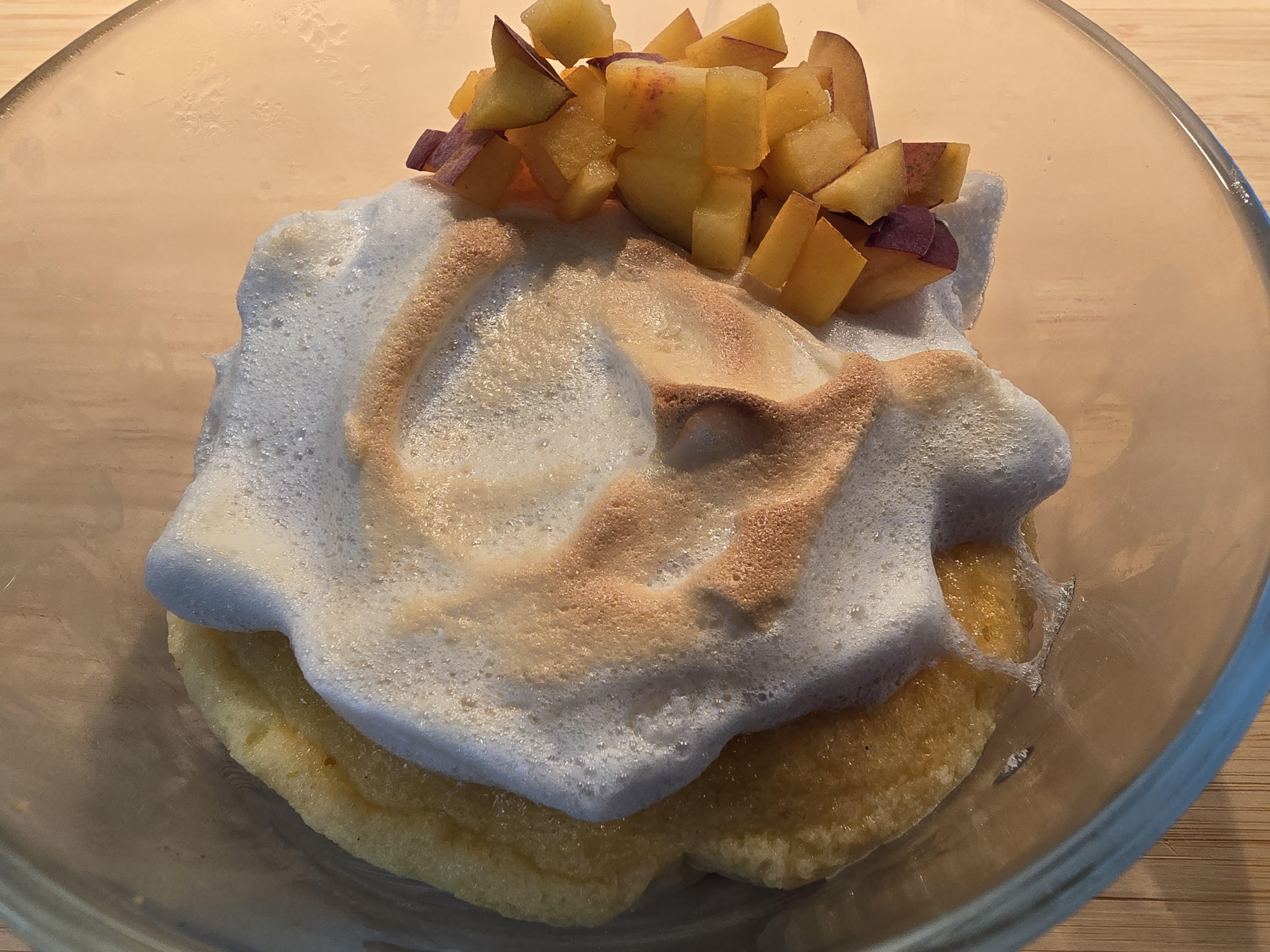 Put 4 egg whites and 95 g sugar in a clean heatproof bowl. Place the bowl over a pot of simmering water, making sure it doesn’t touch the water. Stir or whisk until the sugar fully dissolves and the mixture is hot and smooth (not grainy). Take it off the heat and beat with a mixer until it becomes thick, shiny and forms stiff peaks. Once cakes are cool top with 1/4 of meringue mixture. Top with half a diced peach before serving.