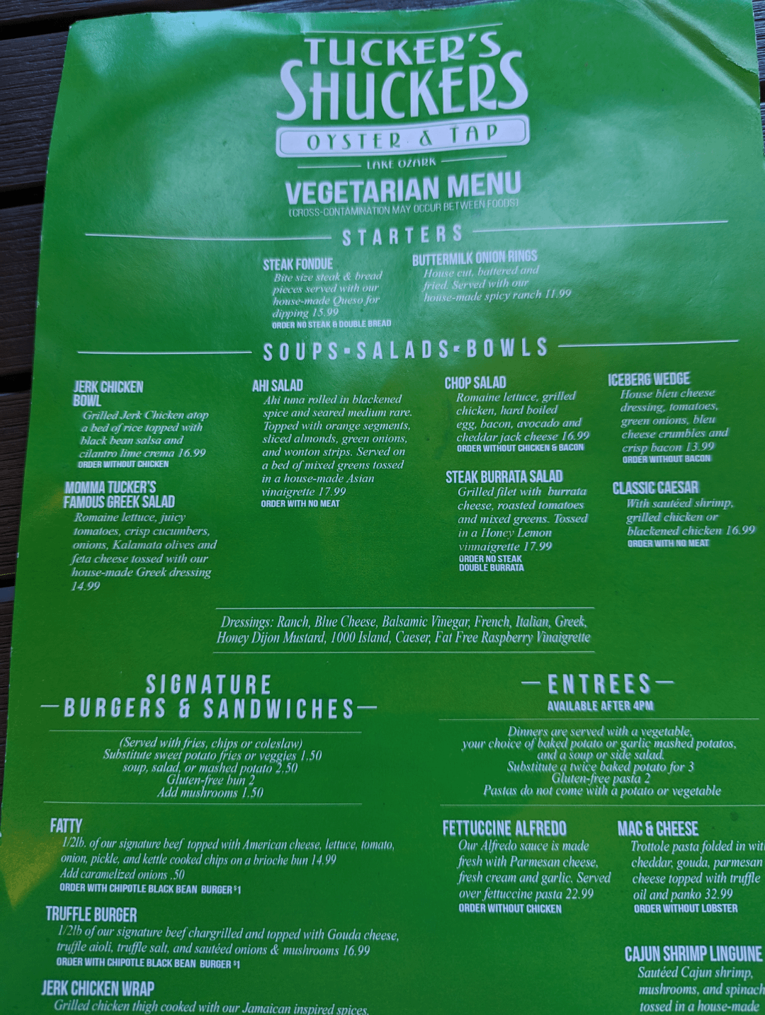 14. As someone who’s not a vegetarian but who has spent a *lot* of time looking for places with options for his vegetarian wife … this seems *fine*? I mean, the place is called Tucker’s Shuckers Oyster & Tap. What do you expect? At least they’re trying. A place with that name, I’d have no expectation for them to have basically any veggie options, much less a separate menu with clear instructions on how to make various menu items vegetarian.