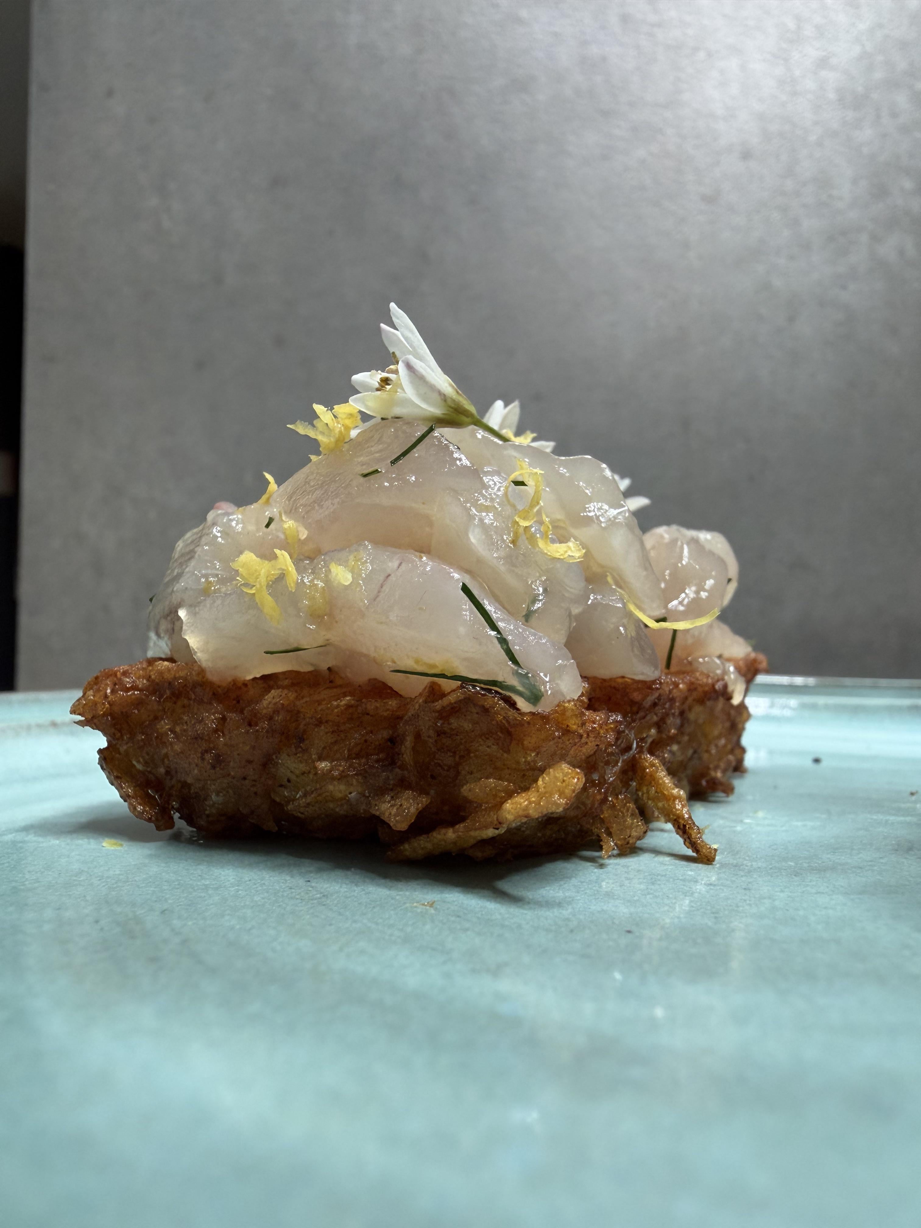 Bonito with yuzu kosho Myer lemon zest and wild garlic flowers on a crispy hash brown by Huntfishgrowcook Food Porn